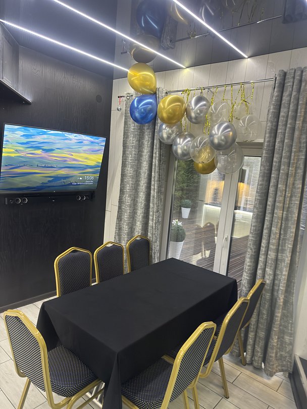 Телезона с музыкальным оборудованием, терраса, балкон и закрытая зона для приготовления барбекю с наличием необходимых принадлежностей.
