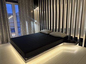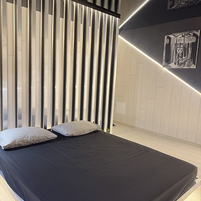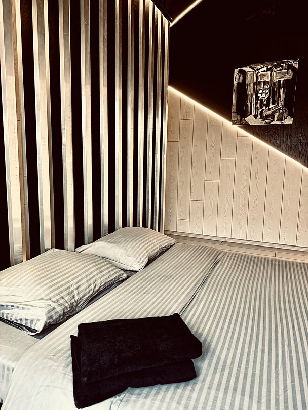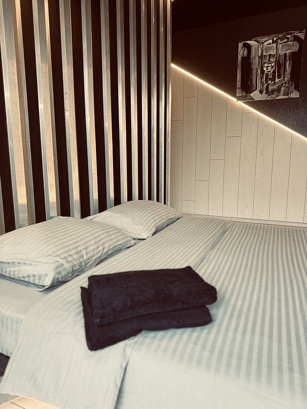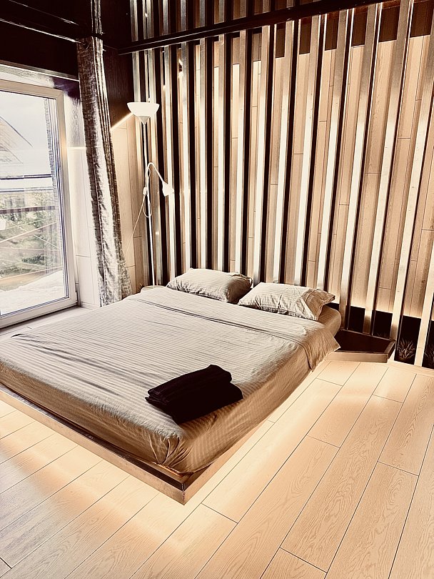 Две просторные спальни с удобными двуспальными кроватями размером 160х200 см, плюс отдельная комната со спальным местом в бане.