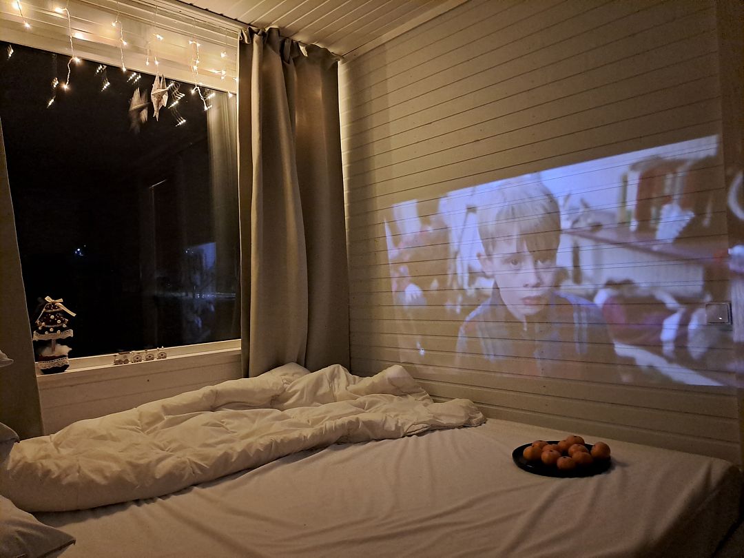 Фильмы на проекторе в кровати создают атмосферу уюта и абсолютное ощущение гармонии от вечернего кинопросмотра.