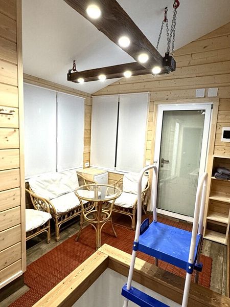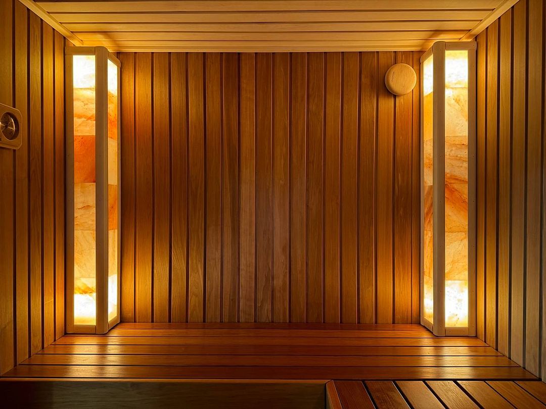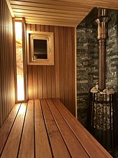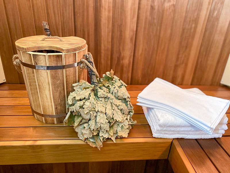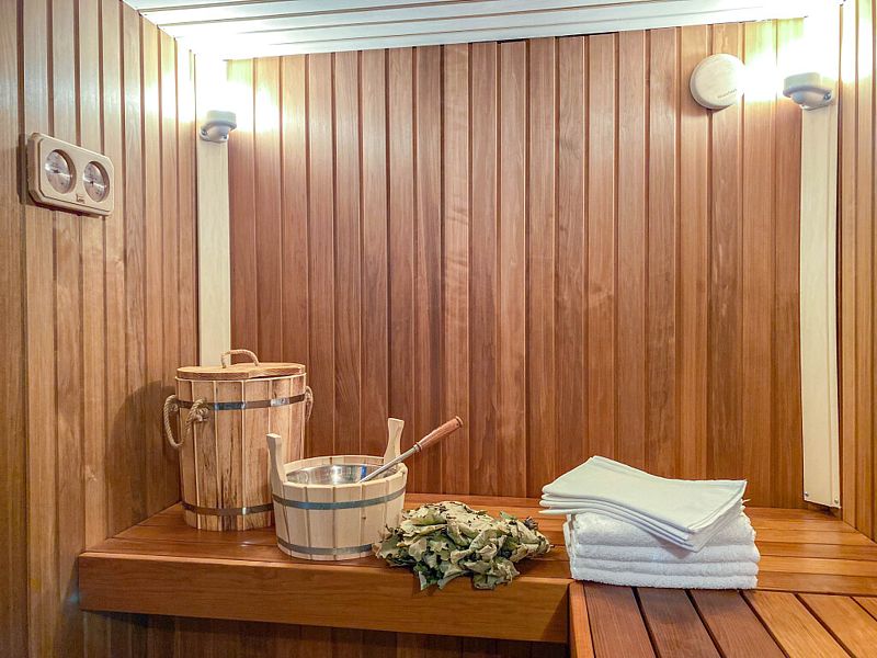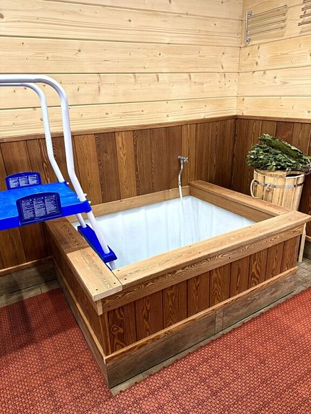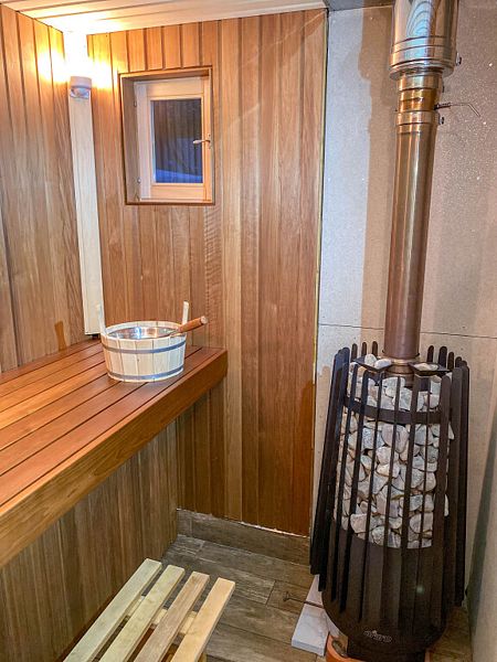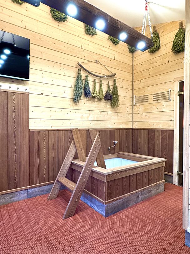 Инфраструктура: купель, полотенца, простыни, шапочки, обливное ведро, душАтмосферная парилка со светильниками из гималайской соли, которые не только создают волшебную атмосферу, но и очень полезны. Дровяная печь с мелкодисперсным паром, а еще она умеет петь, издавая звук вьюги, когда подливаешь воду. Баня может работать в двух режимах (сухая финская сауна и русская влажная баня).