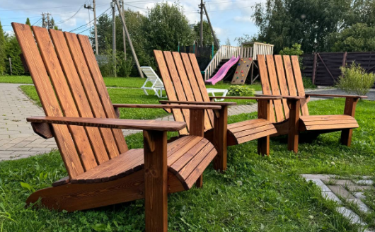 Когда еще не холодно, чтобы греться у камина в доме, и хочется как можно больше находится на улице, самое время посидеть с друзьями вечером возле очага. Для этого появились удобные кресла Адирондак собственного изготовления.