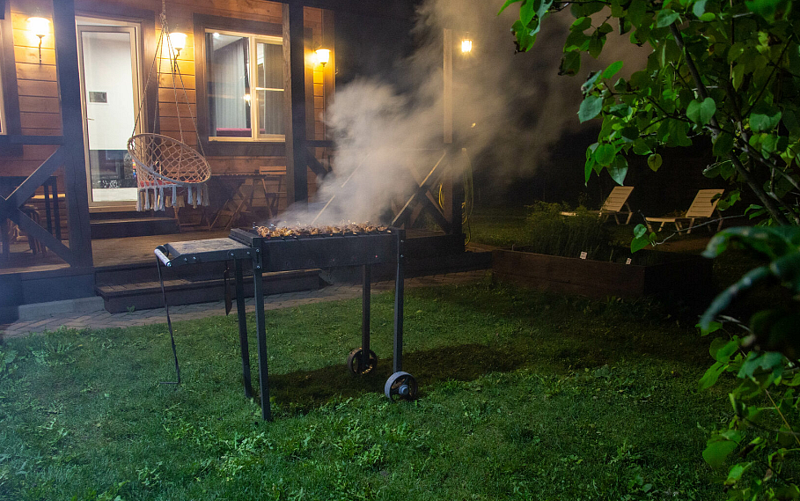Сочный шашлык и овощи на углях. В дождь или снег можно жарить в барбекю под крышей, а когда стемнеет, можно включить свет.