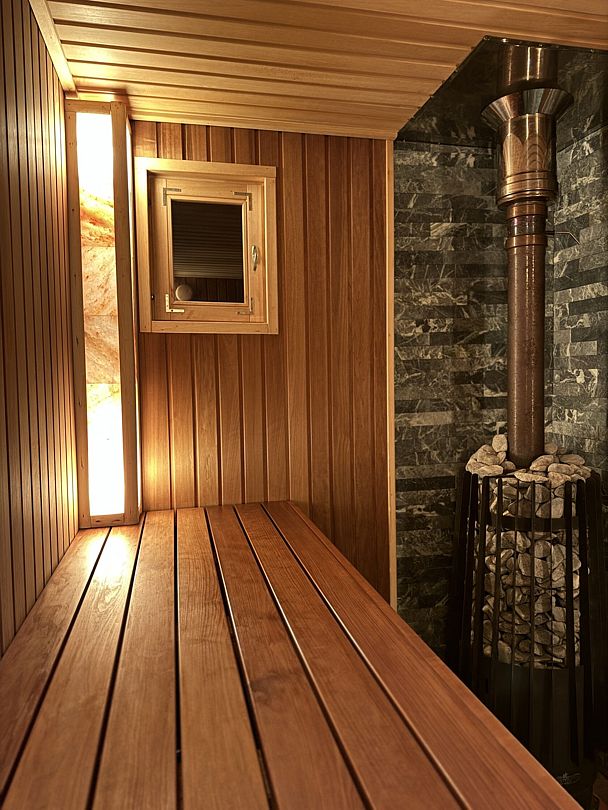 Читать полностьюАтмосферная парилка со светильниками из гималайской соли, которые не только создают волшебную атмосферу, но и очень полезны. Дровяная печь с мелкодисперсным паром, а еще она умеет петь, издавая звук вьюги, когда подливаешь воду. Баня может работать в двух режимах (сухая финская сауна и русская влажная баня).