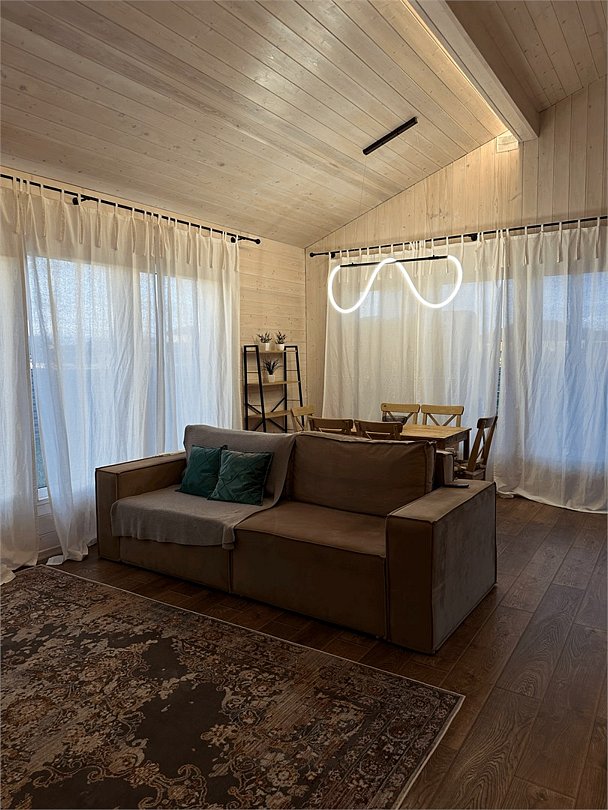 Каждый гость может расслабиться в собственной сауне или воспользоваться просторной террасой для фуршетов и угощений. Просторная зеленая территория открывает множество возможностей для пикников и активного отдыха на свежем воздухе, создавая идеальные условия для празднования особых событий — от дней рождений до корпоративов.