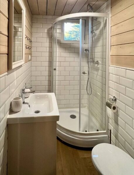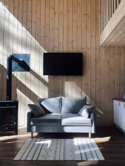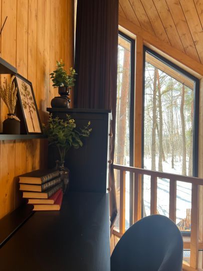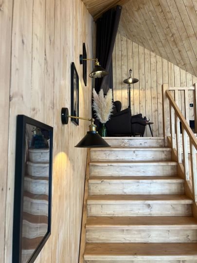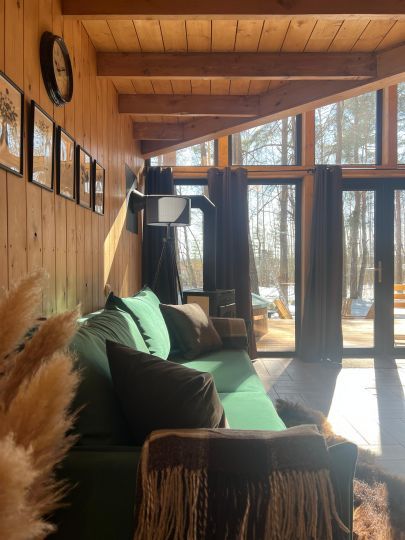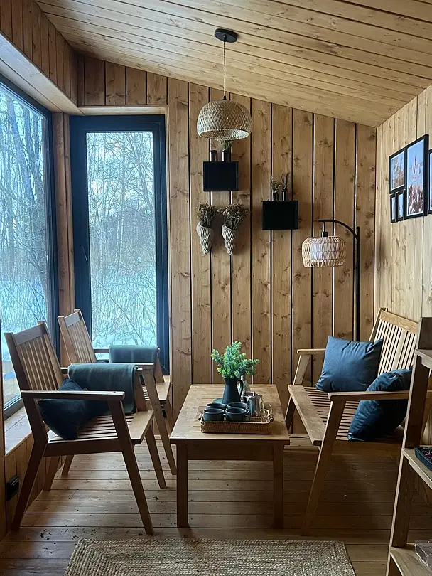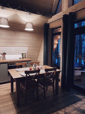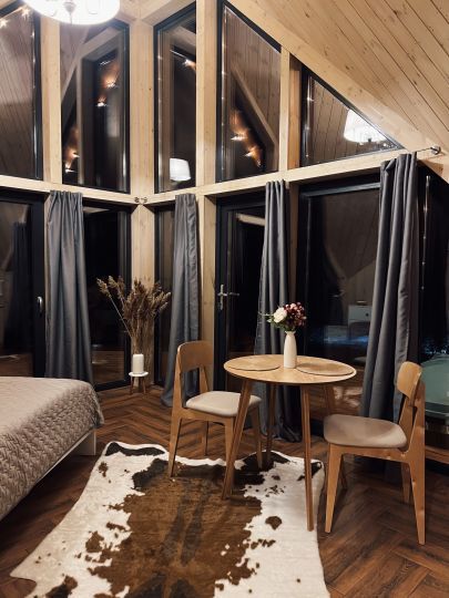 Воплощение комфорта и уюта — новые уникальные дома для двоих с широкоформатным панорамным видом на лес и реку. Просторная терраса, оборудованная кухня с камином, красивый санузел, горячая купель на террасе дома и полноценная двуспальная кровать с потрясающим видом.