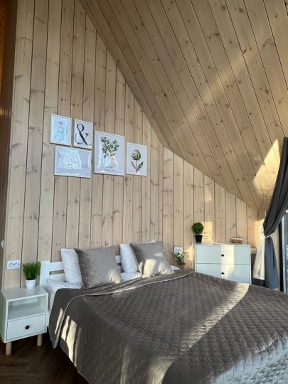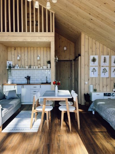 Дом идеально подходит для большой семьи или компании 6–10 друзей. Он включает 4 спальни, 2 санузла и просторную кухню-гостиную с камином и прекрасно оборудованной зоной для приготовления вкусной и полезной еды.