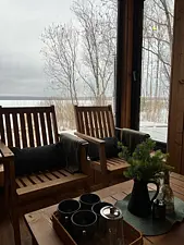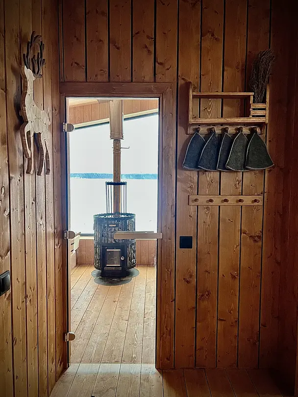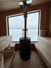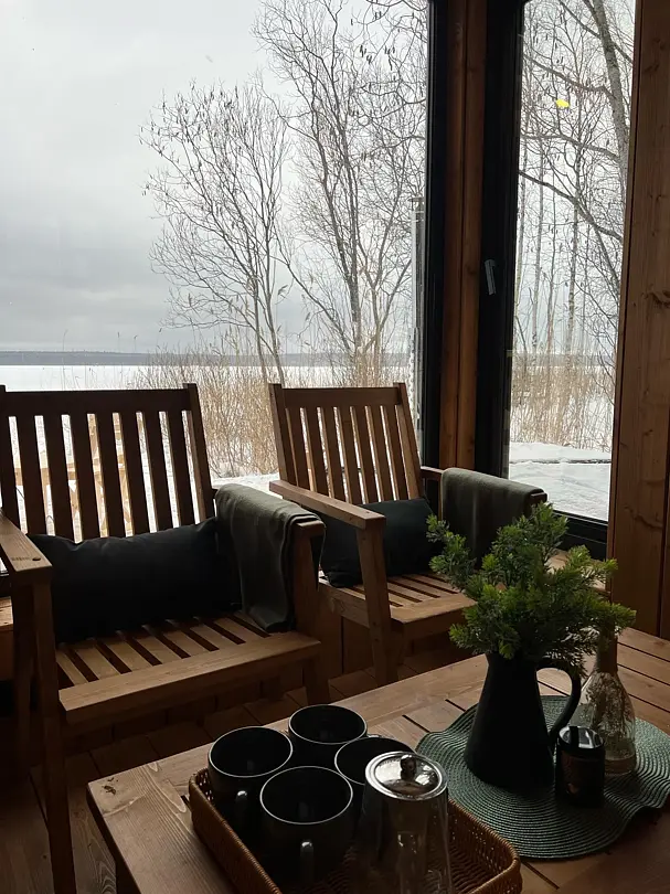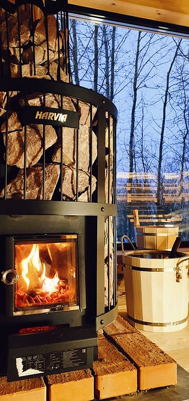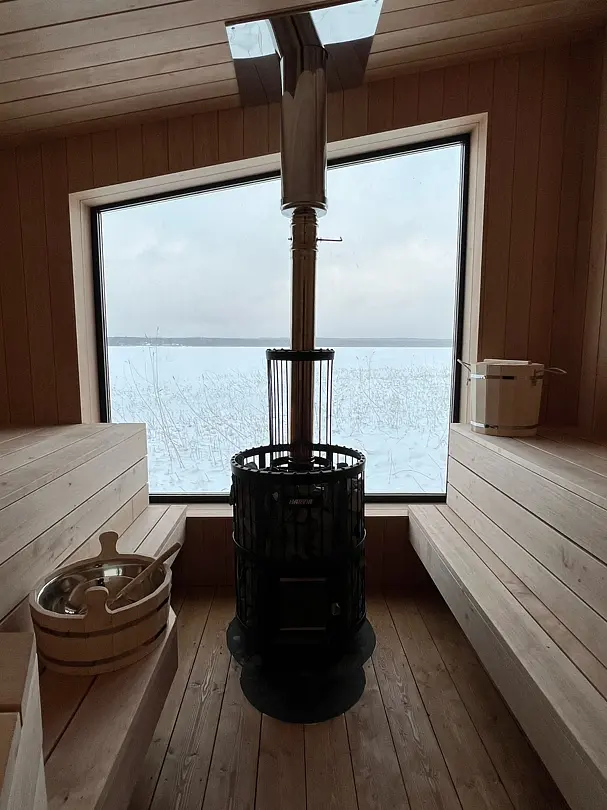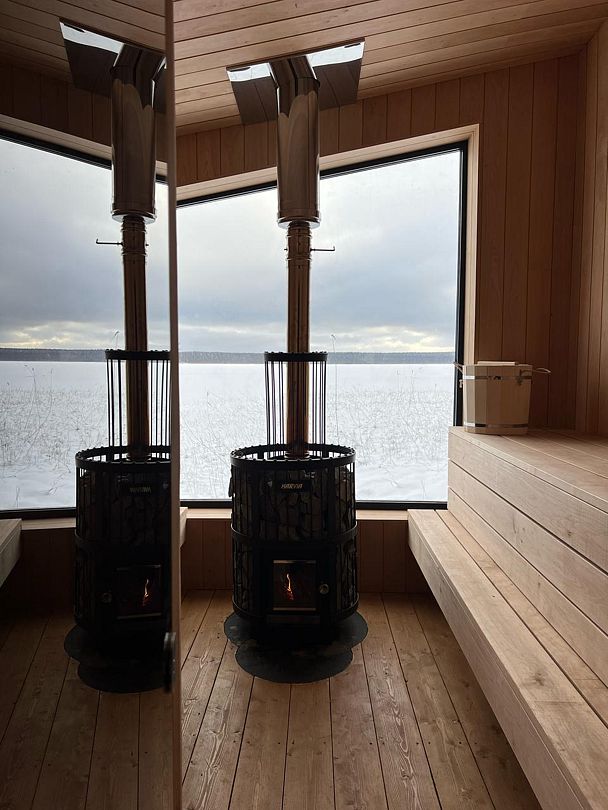 Деревянный сруб, парная с панорамным окном на Вуоксу и дровяной печью, комната отдыха, душевая.