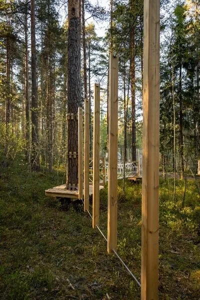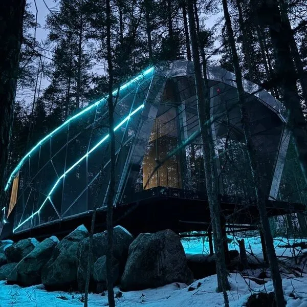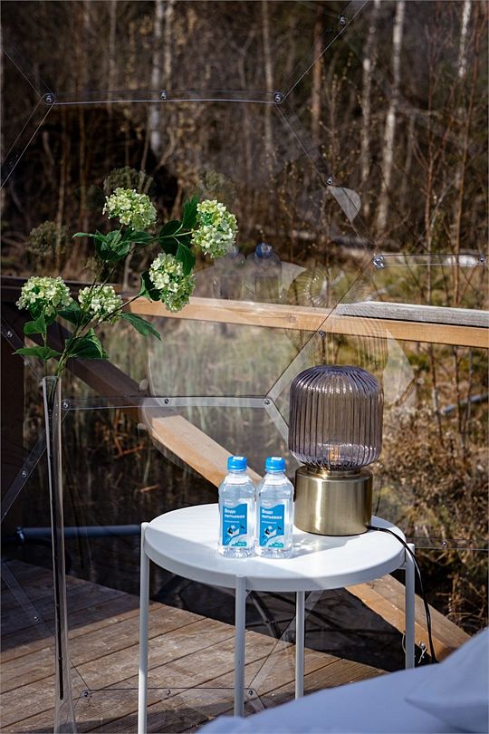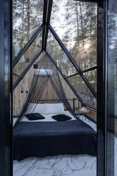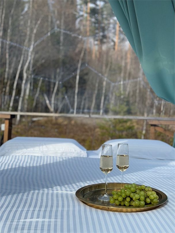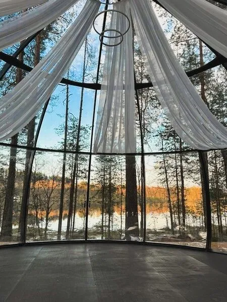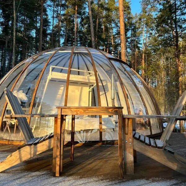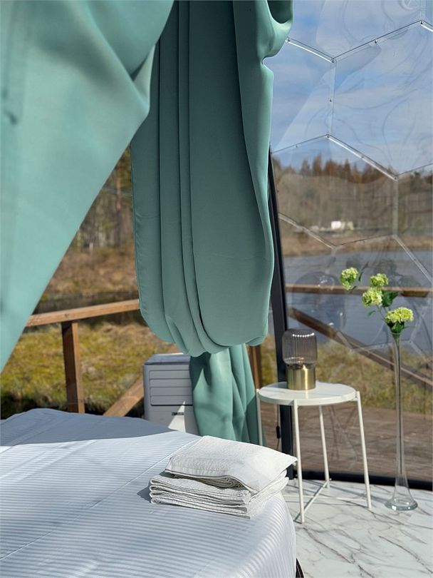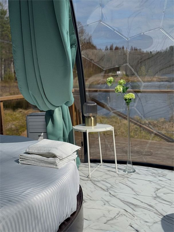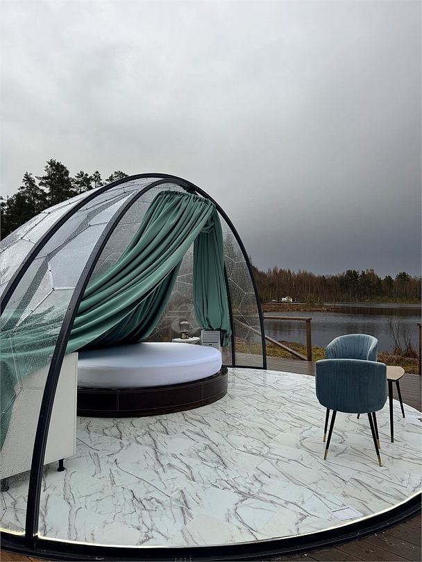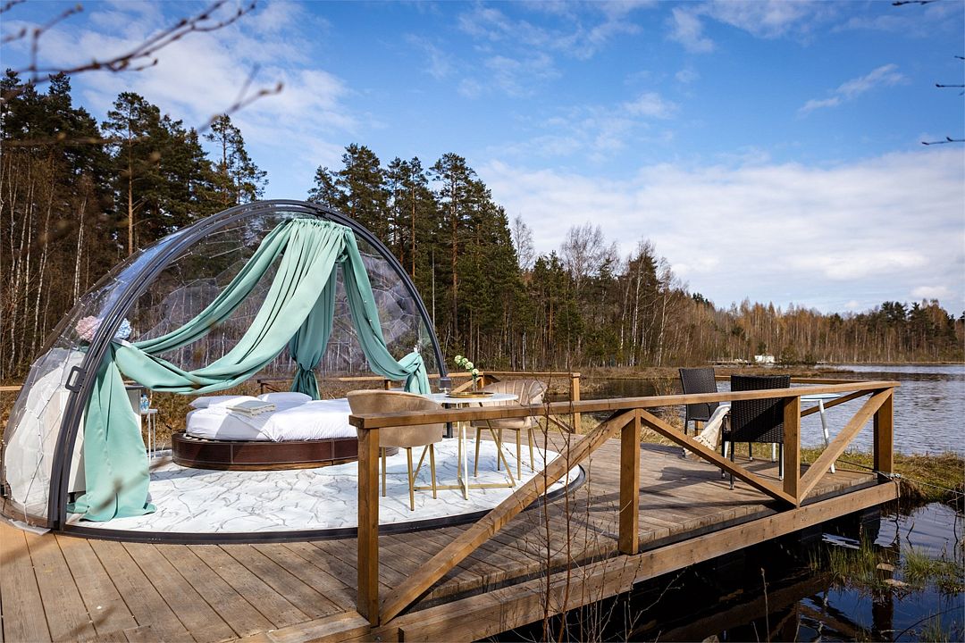 В 45 минутах от Санкт-Петербурга, вдоль берега озера, находится глэмпинг, предлагающий размещение в однокомнатных номерах на воде и двухкомнатных на берегу, а также в новой сфере и kosmos доме.