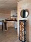 Интерьер в коричневых, зеленых, серых тонах, натуральные материалы и декор: зеркало из можжевельника, деревянные спилы, дровница.