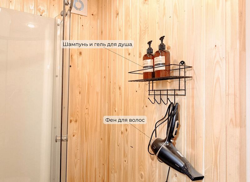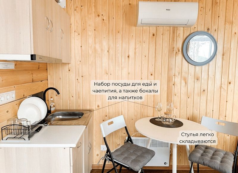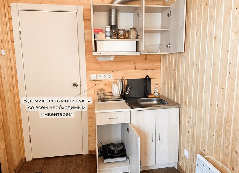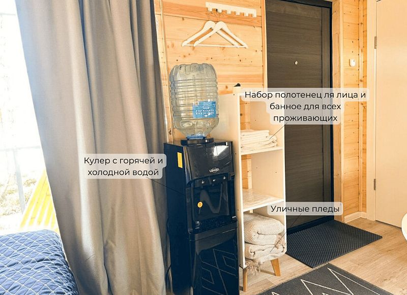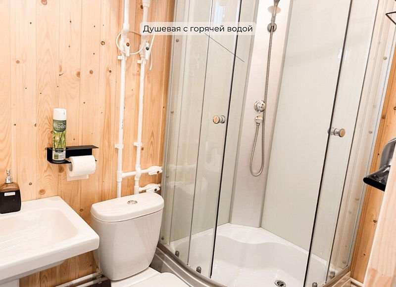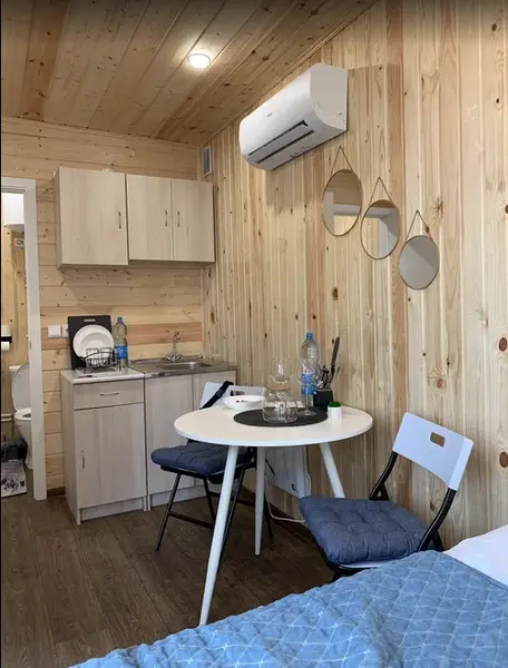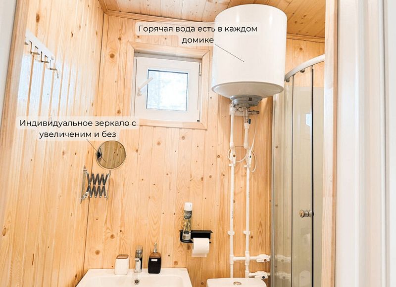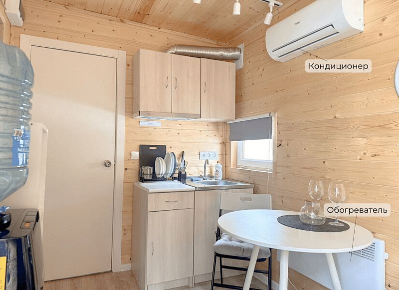 В каждом домике имеется собственный санузел с душем и теплым полом, а также кондиционер, электрочайник, холодильник, набор посуды и кулер с чистой водой.