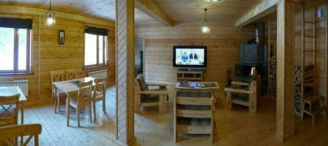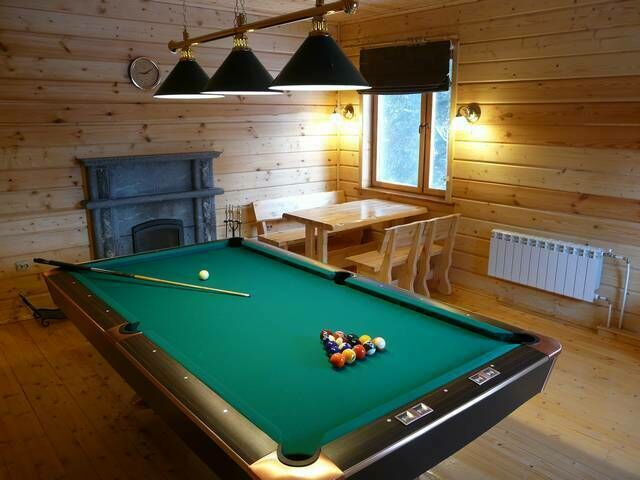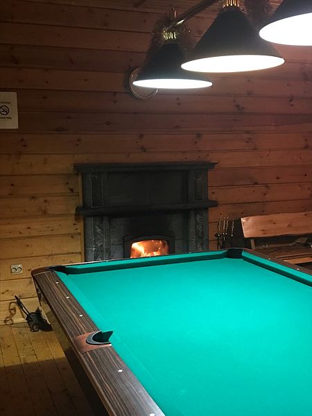 Каминный зал с телевизором, кухня с холодильником и газовой плитой, сауна, бильярдный зал.