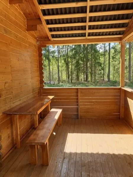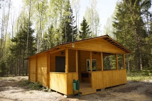 Гриль-домик с террасой на открытом воздухе, зона отдыха и мангальная площадка для проведения корпоративного отдыха, тимбилдинга на 18-25 человек. Расположен на берегу озера, среди густого ельника. Внутри домика — очаг с живым огнем.