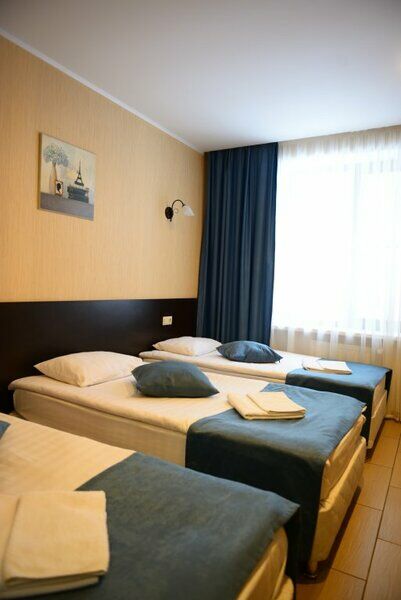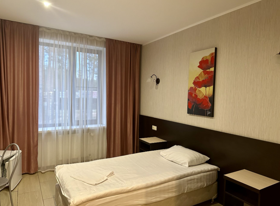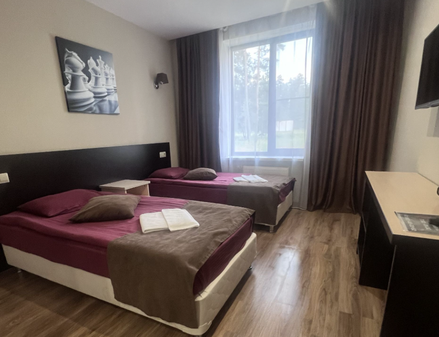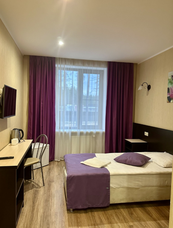 июнь 2022 г.Вроде у трассы, но тихо, к тому же в лесуВ целом гостиница понравилась. Но не без шероховатостей, за которые, правда, я оценку снижать не стал, но ниже упомяну. Системы онлайн бронирования у гостиницы нет, но по электронной почте забронировать удалось быстро. При заезде тоже отдаёт прошлым веком - какие-то отметки по бронированию комнат в бумаге, также ручная запись данных в учётные книги. Ещё парковка перед гостиницей маловата и не для крупных машин (это та, куда Вас, скорее всего, приведёт навигатор. Но машину можно также поставить со стороны кафе и семейного центра, а проехать туда или через гостиницу, или через "Петровича". Гостиница расположена среди сосен, что заметно сказывается на атмосфере, несмотря на проходящее рядом Киевское шоссе, наличие бензозаправки, строительного рынка, химзавода. Сосновый аромат, относительная тишина. В гостинице помимо номеров есть три сауны, зона отдыха с бильярдом и настольным теннисом. Во внутреннем дворе есть беседки и мангалы. Часть номеров первого этажа имеют выход на улицу сразу из номера. Фактически, у гостиницы два крыла: по первому этажу гостиницы можно пройти везде, а вот номера второго этажа разделены и сквозного прохода не имеют. В лобби имеются вендинговые аппараты, также просто продаётся ряд продуктов. На всех этажах имеются кулеры. Доступ в номер по электронному ключу, но у нас ключ успел распрограммироваться уже на следующий день... Жил в стандартном номере. В номере, в принципе есть всё, от лопатки для обуви до чашек с чайником. Качественное кабельное ТВ с огромным количеством каналом, в том числе много каналов в формате HD. Wi-Fi работает хорошо. Кстати, картины, которые размещены в номере и коридоре, приклеены - не упадут. Кафе имеется, но вход отдельный с улицы со стороны бензозаправки. По умолчанию, завтрак не включается в стоимость. Кафе работает с 7-30 до 21-00. Работает по схеме с линией раздачи. На завтрак есть и каша, и яичница, и запеканка, и сосиски, и даже более сытные, обеденные, блюда. У меня выходило рублей на 300-350. Ну а если голод подобрался к Вам после 21-00, то можно подкрепиться на соседней бензозаправке. В части расположения... Для автомобилистов оно отличное. Но если Вы путешествуете на общественном транспорте, то придётся походить пешком, так как от ЖД- и автовокзала будет где-то два километра пешком. Гостиница современная и я её безусловно рекомендую всем!