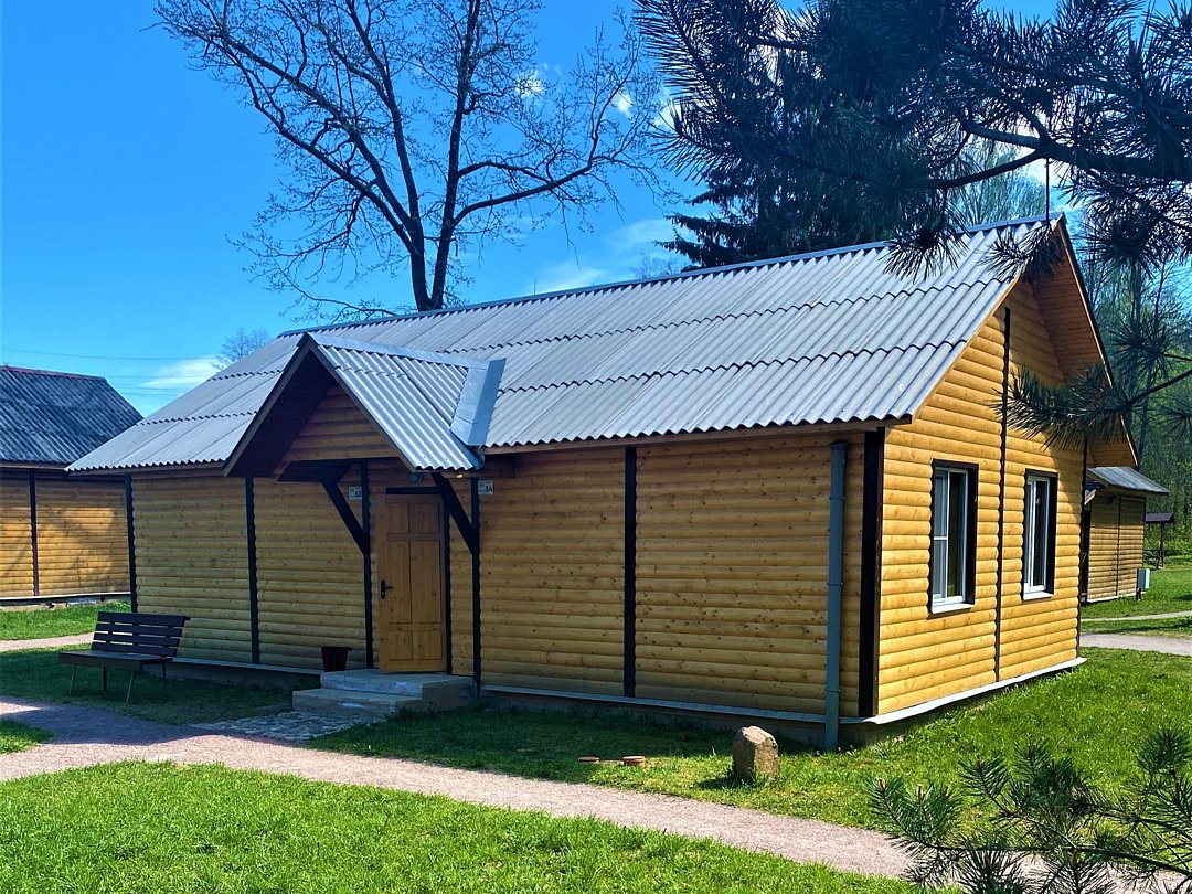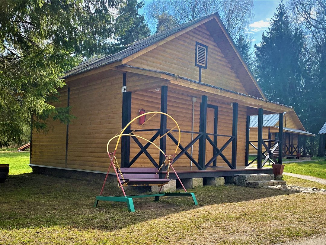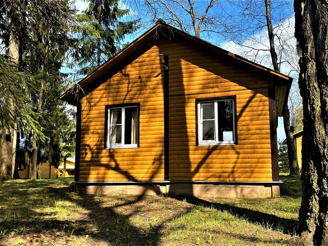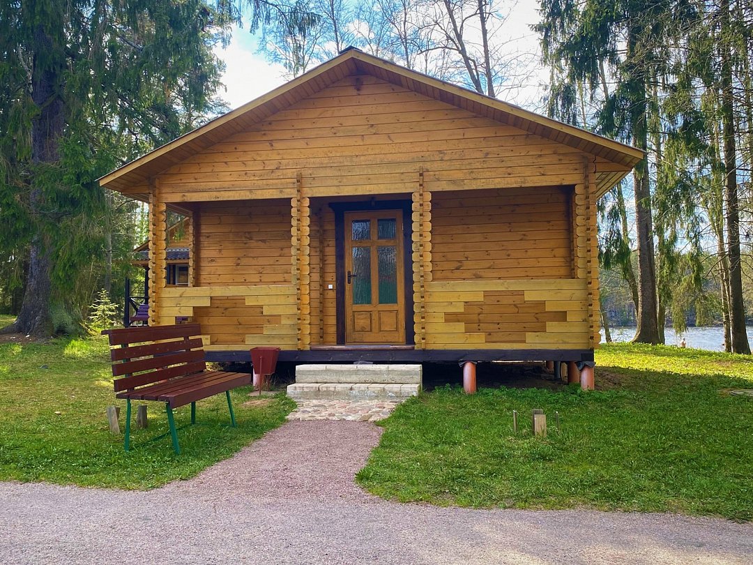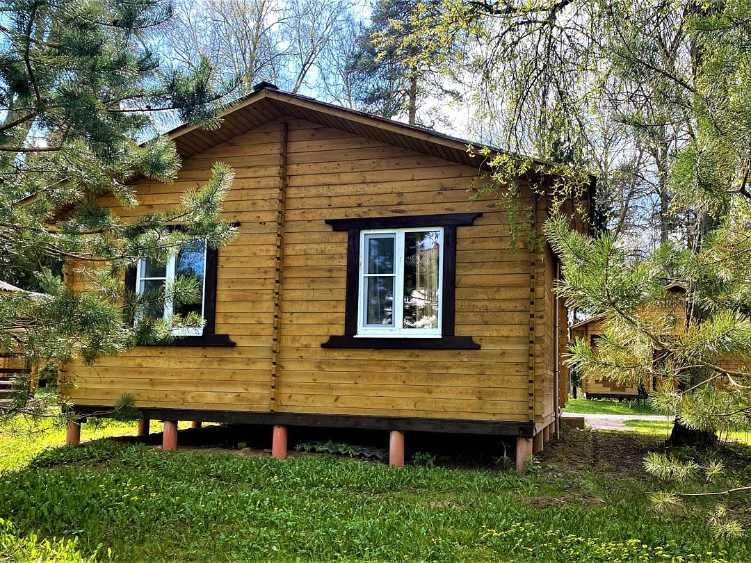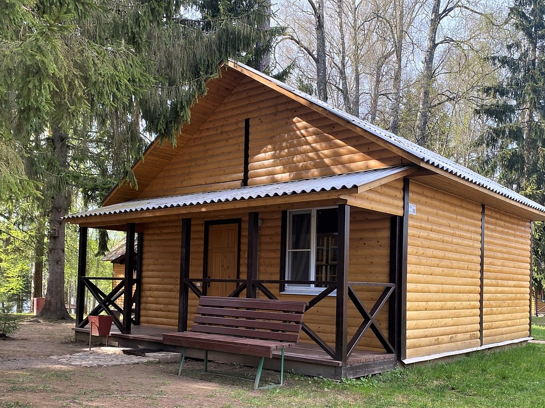 Новый летний домик из профилированного бруса на 2 человек. 1/2 домика с небольшой террасой и отдельным входом, две кровати, холодильник, электрический чайник, TV, санузел. Общая кухня и душевые в отдельно стоящем здании. Открыт на сезон - с 1 мая по 30 сентября. До озера 50 метров. На территории много беседок.В номере