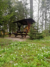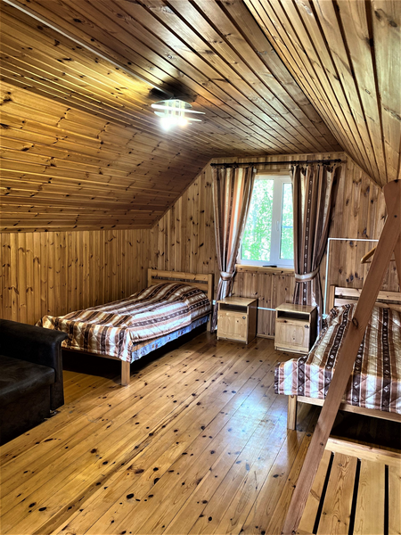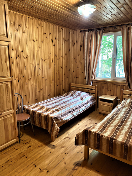 Летний домик из профилированного бруса двухъярусный на четырех человек. Две кровати, кухня, холодильник, электрический чайник, TV, санузел. На втором ярусе - два спальных места (матрасы). Душевые в отдельно стоящем здании. Открыта на сезон -с 1 мая по 30 сентября. На территории много беседок.В номере