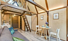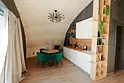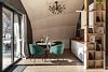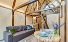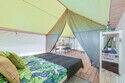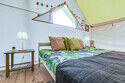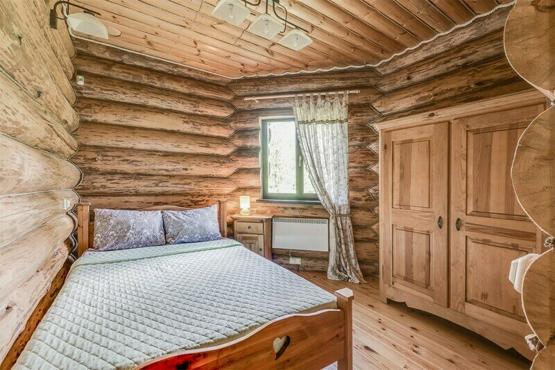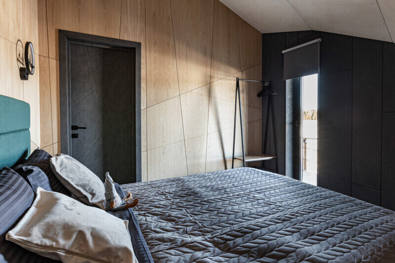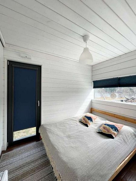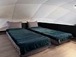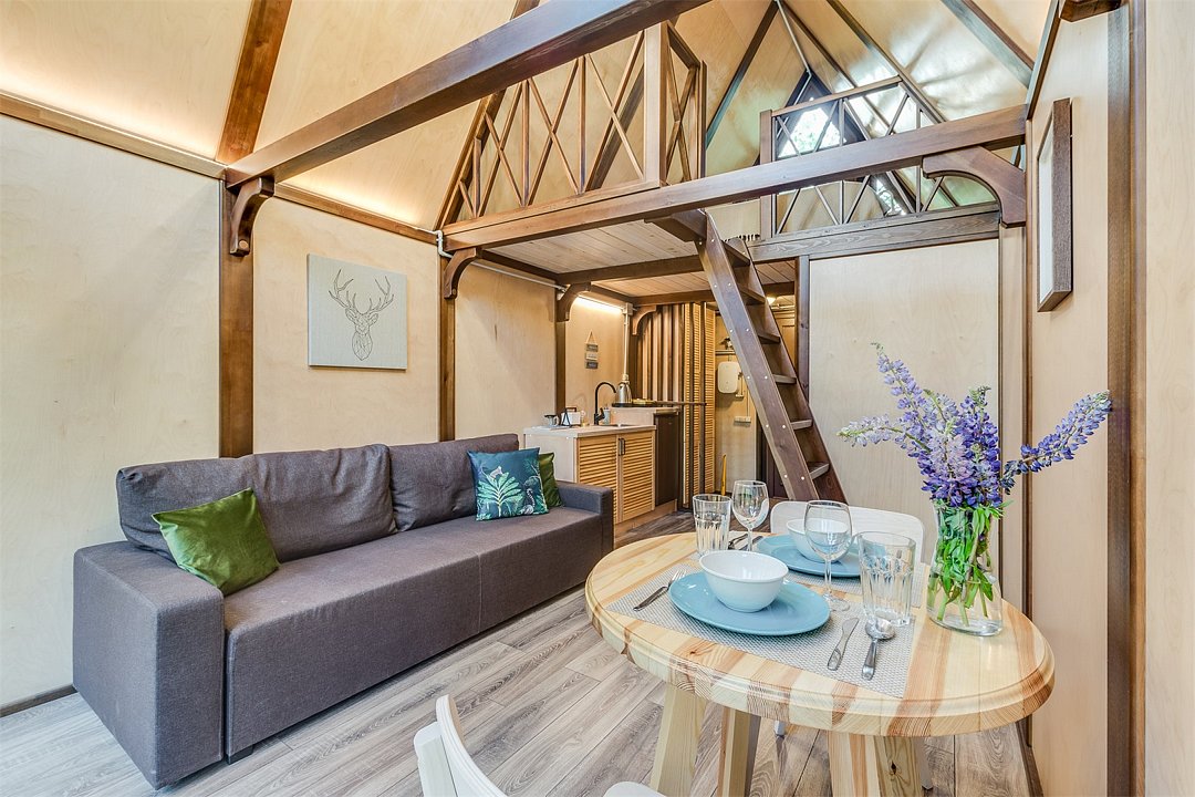 - Мебель: двуспальная кровать, полутораспальный матрас на 2 этаже, вешалка для одежды, прикроватные тумбочки, зона отдыха — кресла и журнальный столик.