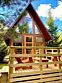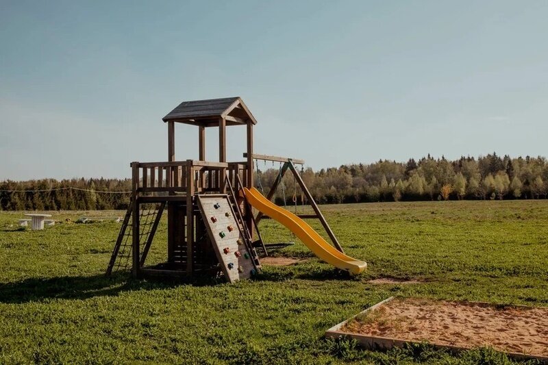 Рядом с летним ресепшеном есть детская площадка с горкой, качелями, брусьями, со стеной – лазалкой, а также есть крытая зона отдыха (доступна только в летний период).