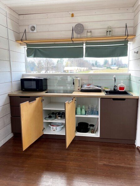 - Кухня: электрическая плита, мини-холодильник, тиабар, посуда и столовые приборы, раковина.