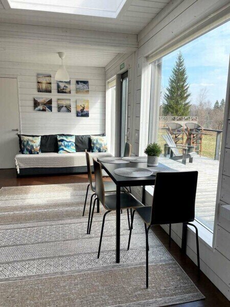 Небольшой, но уютный двухэтажный домик с панорамными окнами.