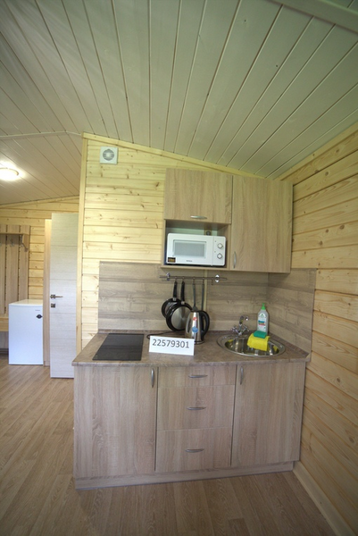 В кухне-гостиной: обеденный стол и стулья на 3-х гостей, прикроватная тумба, табуретка, диван-кровать, два кресла (разбираются), телевизор, варочная панель на 2 конфорки, посуда для приготовления еды, электрический чайник, столовые приборы, микроволновая печь, мини-холодильник, санузел с душевой.