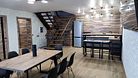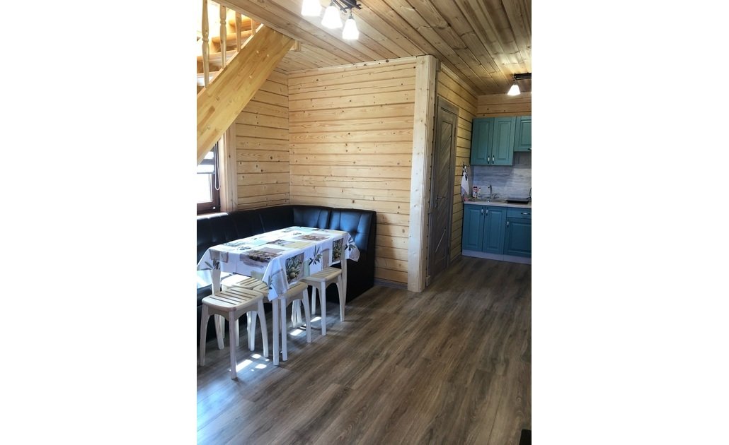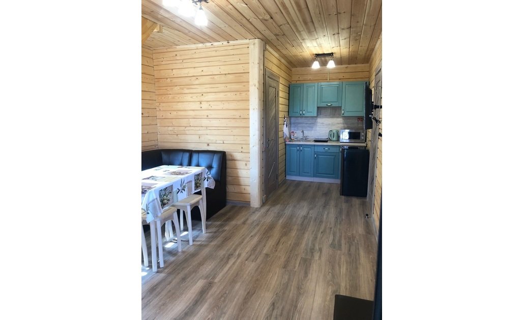 Современный коттедж оборудован всем необходимым для комфортного пребывания у нас. Большая кухня-гостиная с обеденным столом позволит вместиться небольшой компании. На кухне есть микроволновая печь, чайник, индукционная плита, посуда, маленький холодильник.