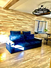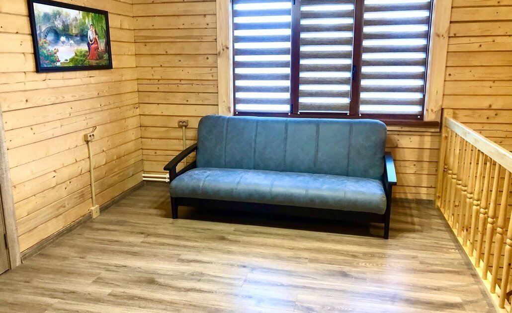 На втором этаже: также располагается большой холл, что позволяет разместить дополнительные спальные места (стоимость дополнительного размещения уточнять у администраторов), диван раскладной (на двух человек), два кресла.