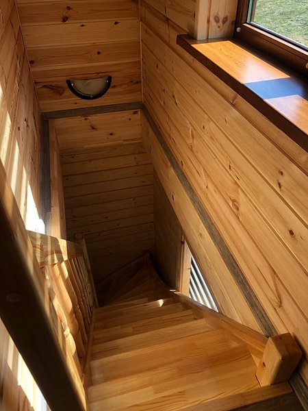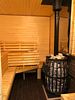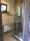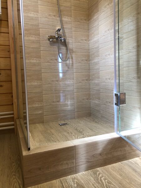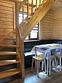 На первом этаже: располагается холл с двуспальным раскладным диваном (на 2-х человек), кухня, оснащенная всем необходимым для комфортного прибывания, обеденный стол для большой компании, телевизор, комод, камин, туалет и две душевые. Парная также находится на первом этаже.
