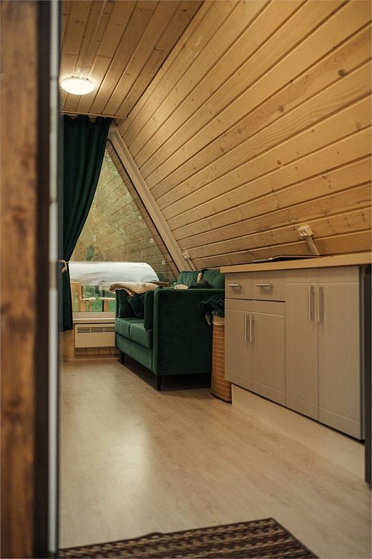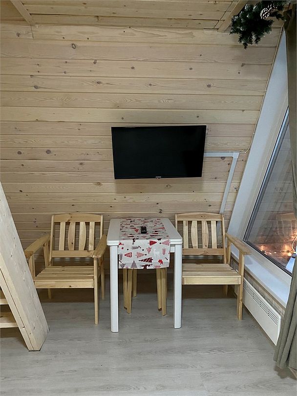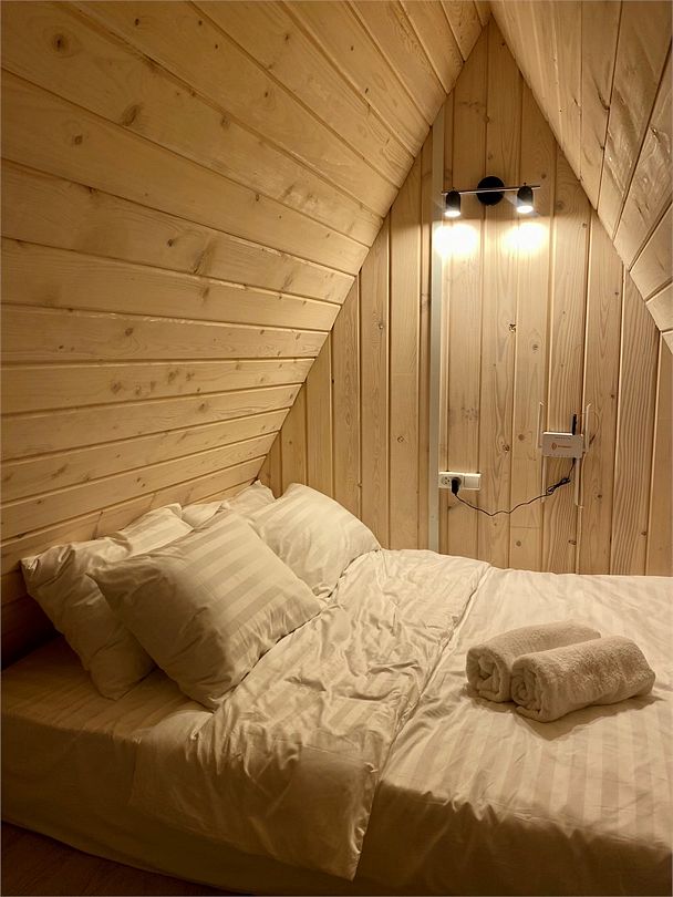 Внутри домика создано все для комфортного проживания. Внизу двухспальный диван, оборудованная кухня, телевизор, туалет и душ. На втором этаже двухспальная кровать с ортопедическим матрасом. Есть Wi-Fi. А еще к нам можно с домашними питомцами, для них проживание бесплатно.Услуги и удобства