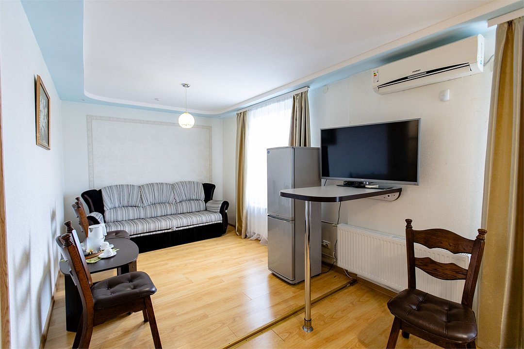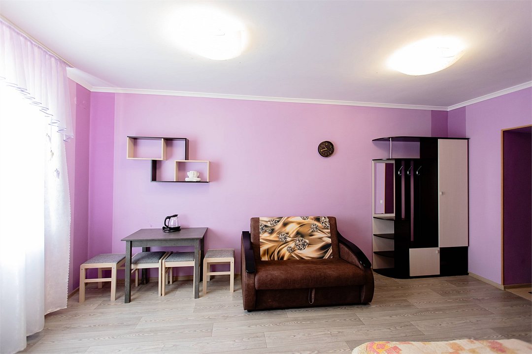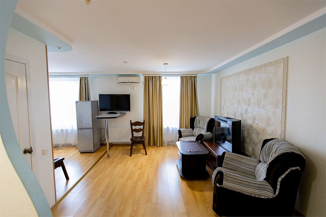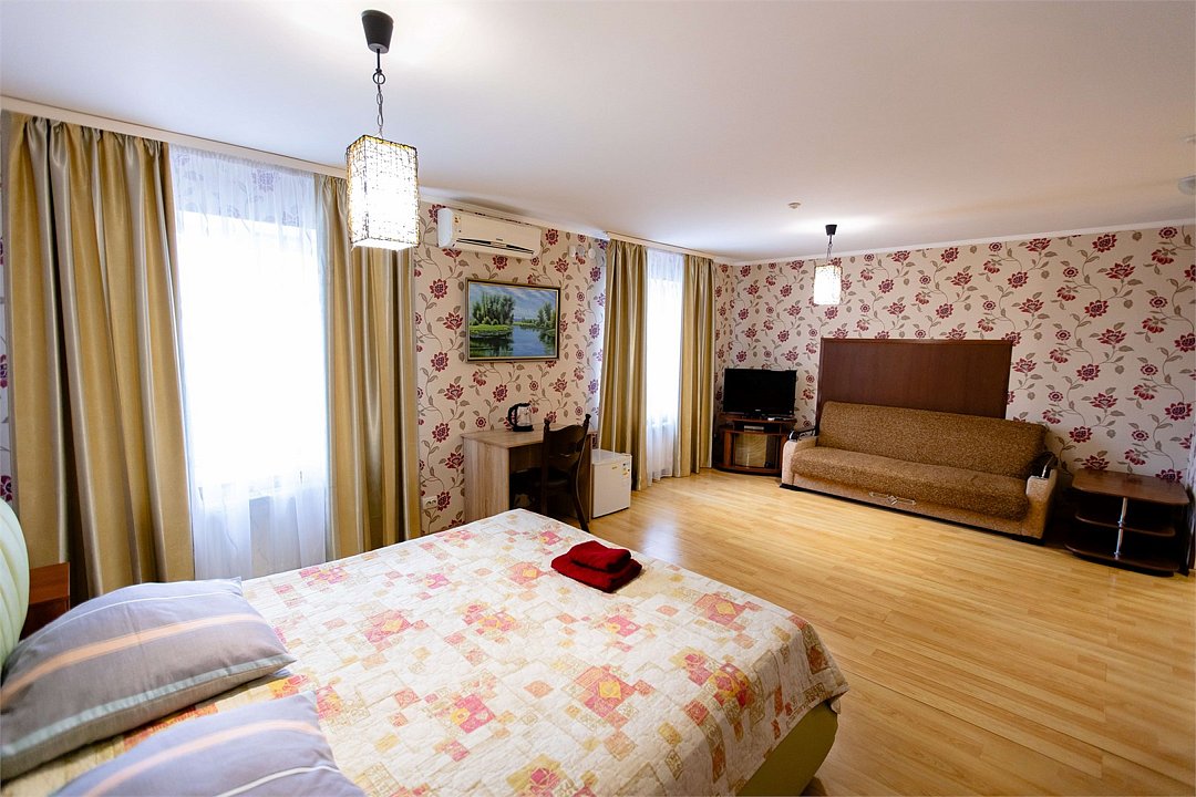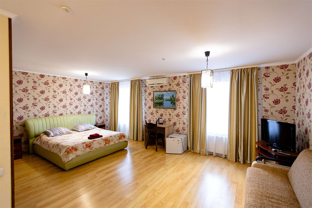 Двухкомнатный номер с двуспальной кроватью и диваном. Площадью более 45 кв. м В номере есть: телевизор, кондиционер, мебельный гарнитур, приветственная вода, электрический чайник, чайно-кофейный набор, тапочки, ванные принадлежности.Услуги и удобства