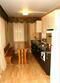Просторная кухня: барная стойка с освещением, встроенная, корпусная кухня, электродуховой шкаф, электроварочная панель, вытяжка, мойка, большой холодильник, микроволновая печь с грилем, электрочайник, кухонная посуда, стол, стулья, утюг.