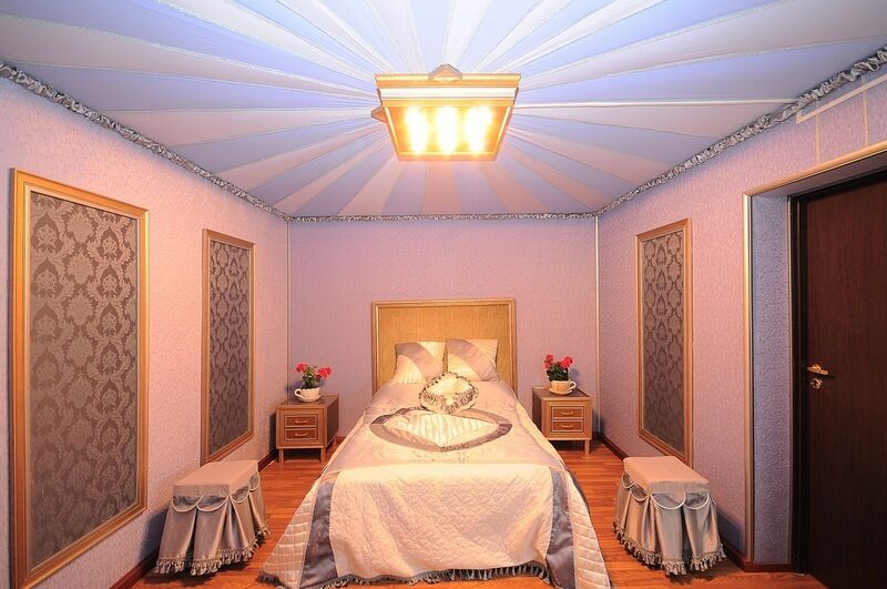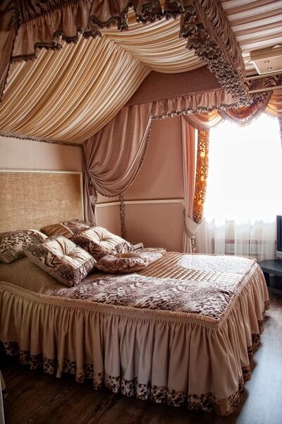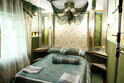 2 спальни с индивидуальными интерьерами: в каждой – 2-х спальная кровать, столик, женский столик, подушки, пуфик, постельное белье, полотенце.