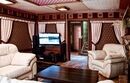 Кожаный большой квадратный диван в просторной нише, свободно трансформирующийся в огромное двуспальное место. ЖК телевизор 46 дюймов, домашний кинотеатр, музыкальный центр.