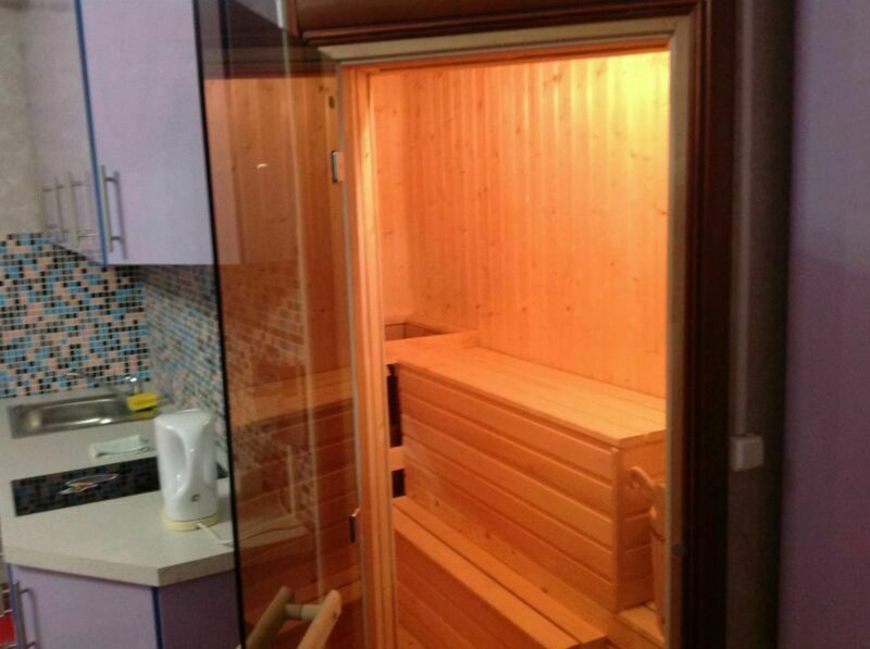 Сауна: лежанка, подголовник, ведро, ковш, электропечь 30 минут -100 градусов, вместимость 4-6 человек.