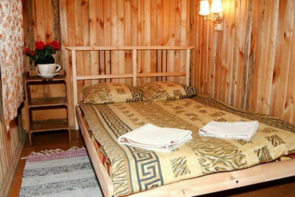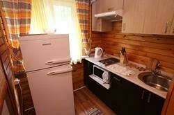Отдельно стоящий деревянный дом (дом №3), в котором Вас ждут 2 раздельные спальни, веранда-зал и небольшая кухня с электроприборами (чайник, холодильник, электрическая плита, микроволновка, посуда).