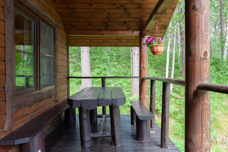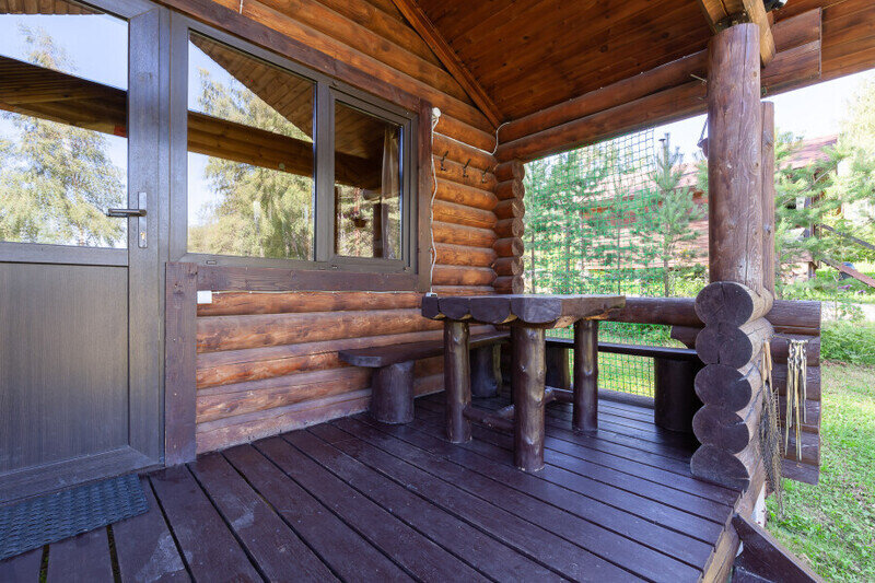 В предбаннике и на террасе есть два стола с лавками для проведения застолий. На террасе есть лестница в воду, благодаря которой удобно подниматься из воды во время купания после посещения парной.