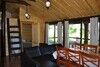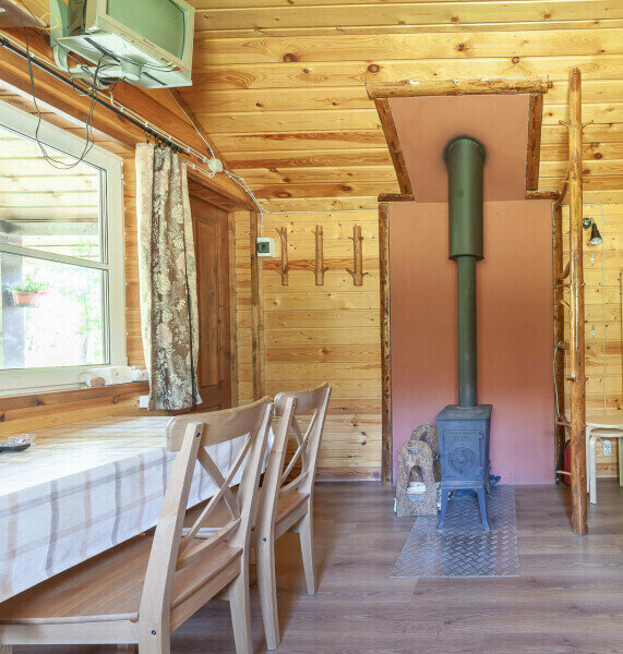 В домике есть: терраса со столом и стульями. В холле находится раскладной диван и над ним двух местная лежанка, обеденный стол, норвежская дровяная печка, кухонная панель с мойкой для посуды. Совмещённый душ и туалет.