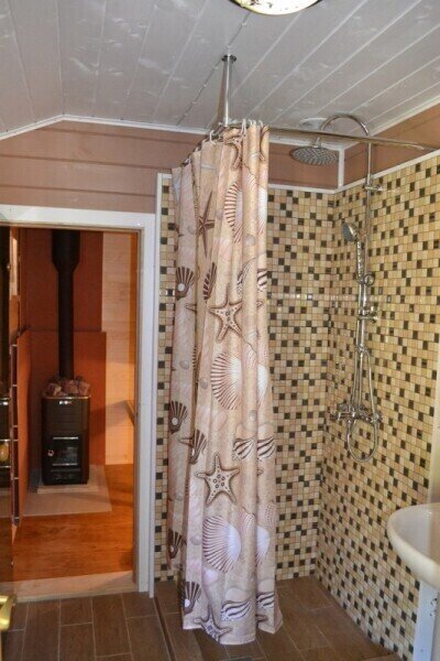 Дровяная сауна с финской печкой. Совмещённый душ туалет. Рядом с коттеджем находится мангал и поленница с дровами.