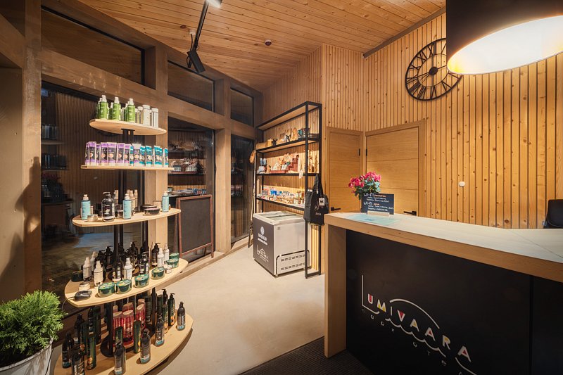 Гости базы отдыха Лумиваара могут арендовать купель вместе с баней, которая находится на плаву. Купель рассчитана на четырех человек, она представляет собой чан с подогретой водой, температура которой составляет около 37 градусов, также есть гидромассаж, который как и подсветка купели включается отдельными кнопками.