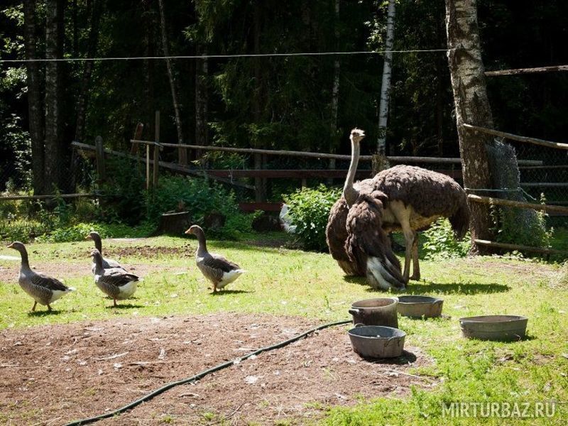 Мини-зоопарк с африканскими страусами, лошадью, осликами, гусями и курами. Можно приобрести страусиные яйца.