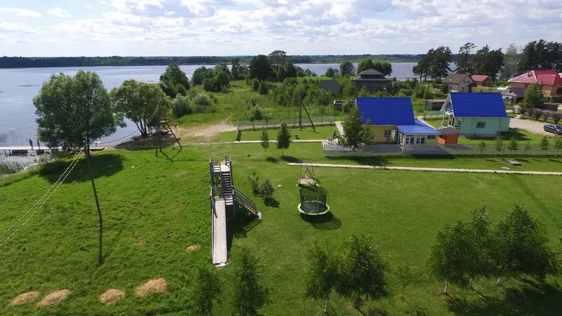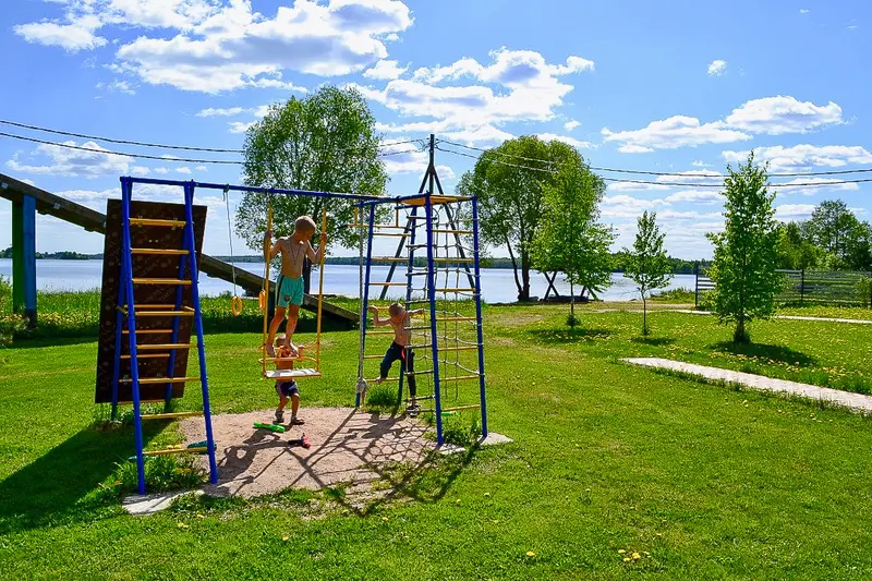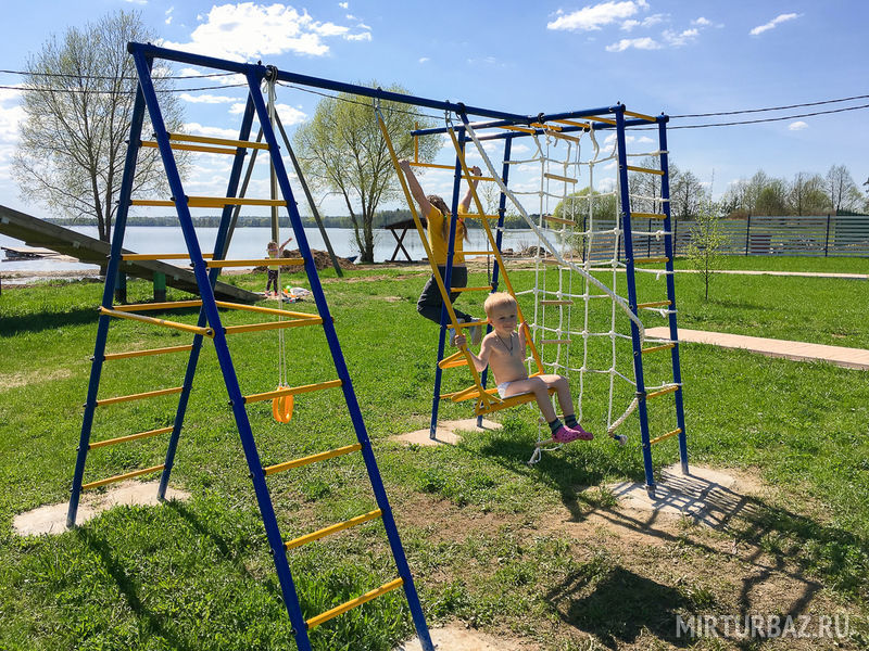 На территории базы организована площадка для маленьких гостей с качелями, горками, веревочными снаряжениями и песочницей. Оборудована спортивная футбольная площадка. Все домики расположены на первой береговой линии, собственный пляж, пирс, лодки для прогулок и рыбной ловли. Площадь комплекса очень ухожена, высажены плодовые деревья, везде проложены дорожки, зимой прочищается от снега.