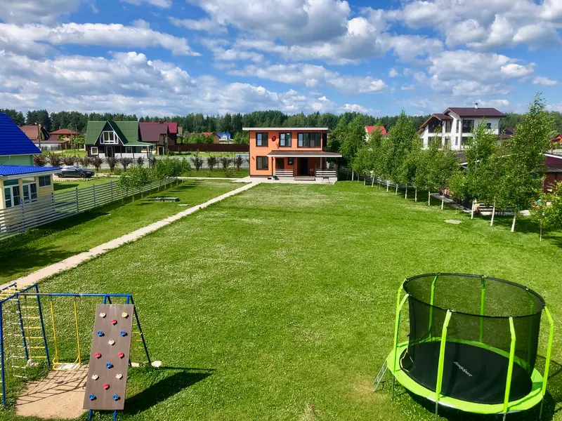 Апельсиновый коттедж рассчитан на 10 и более человек. К их услугам на 1 этаже гостиная с диваном и креслами, спальня, 2 санузла, финская баня, небольшой кухонный уголок, на втором этаже разместились общий холл и четыре спальни.