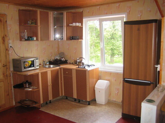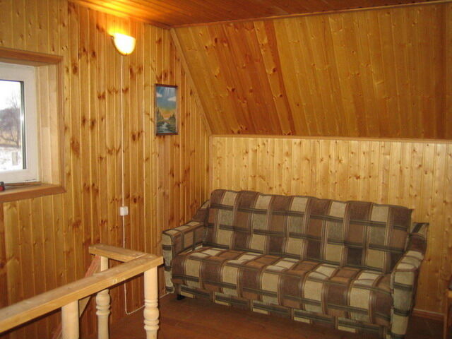 На первом этаже размещена игровая комната (русский бильярд, настольный футбол, дартс). На втором этаже, куда ведет отдельный вход, большая гостиная (около 50 кв.м.) с оборудованной кухней (мебель, газ.плита, вытяжка, холодильник, микроволновая печь, посуда). В гостиной двуспальный диван, 2 кресла, журнальный столик, телевизор, DVD-караоке, музыкальный центр. Две спальни по 12 кв.м. с видом на реку и липовые аллеи, в каждой спальне двуспальная и односпальная кровати. Санузел с душевой кабиной, электрический водонагреватель на 150 литров.