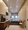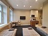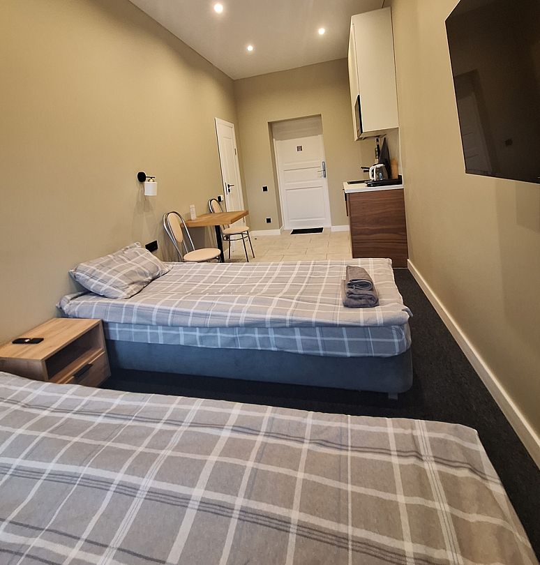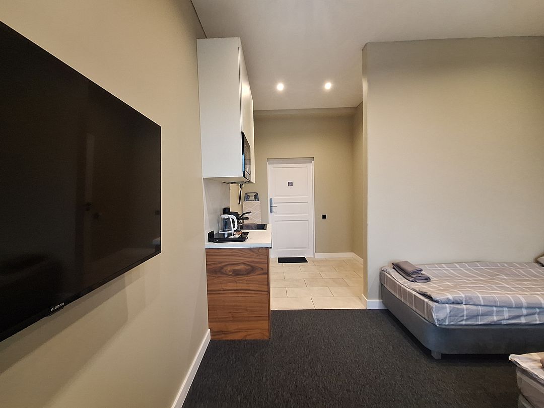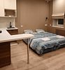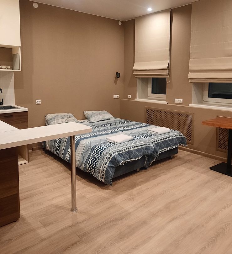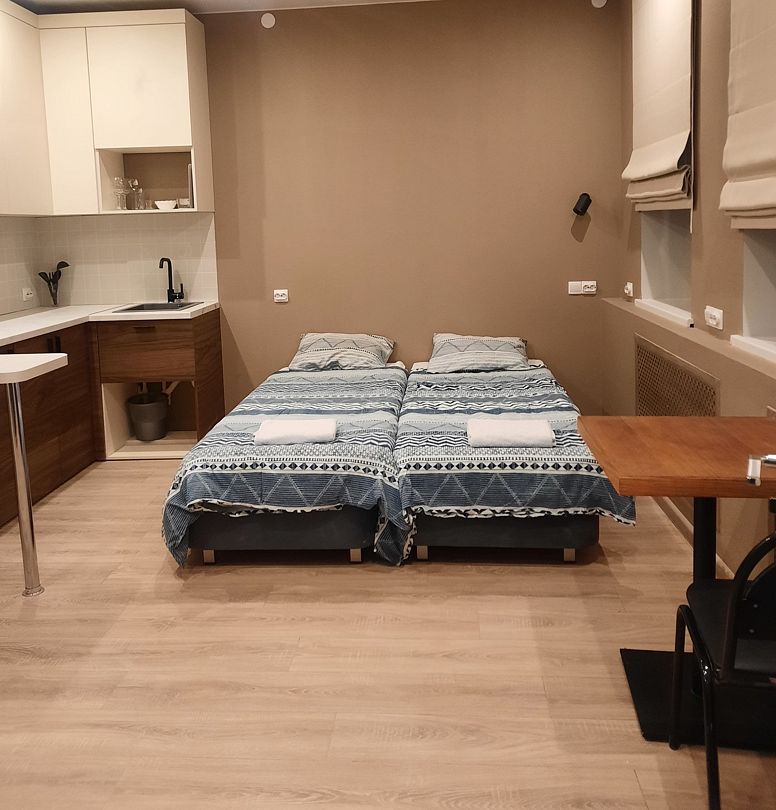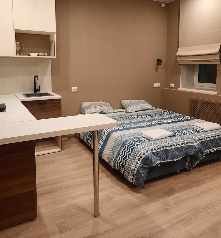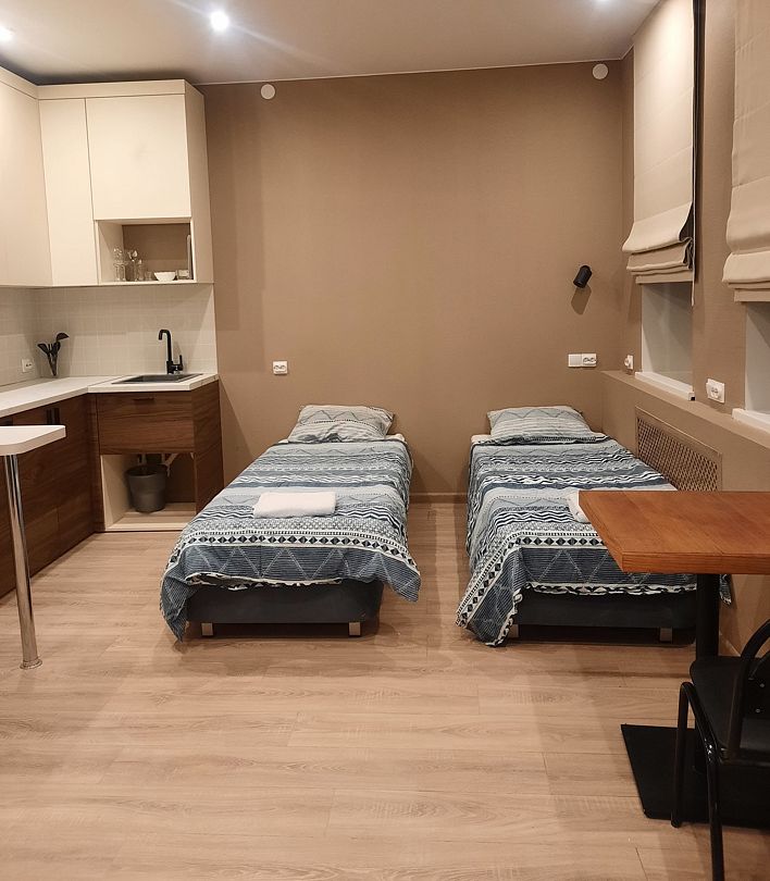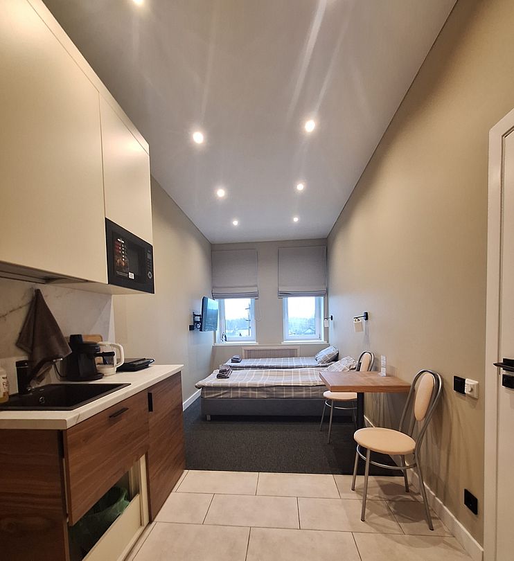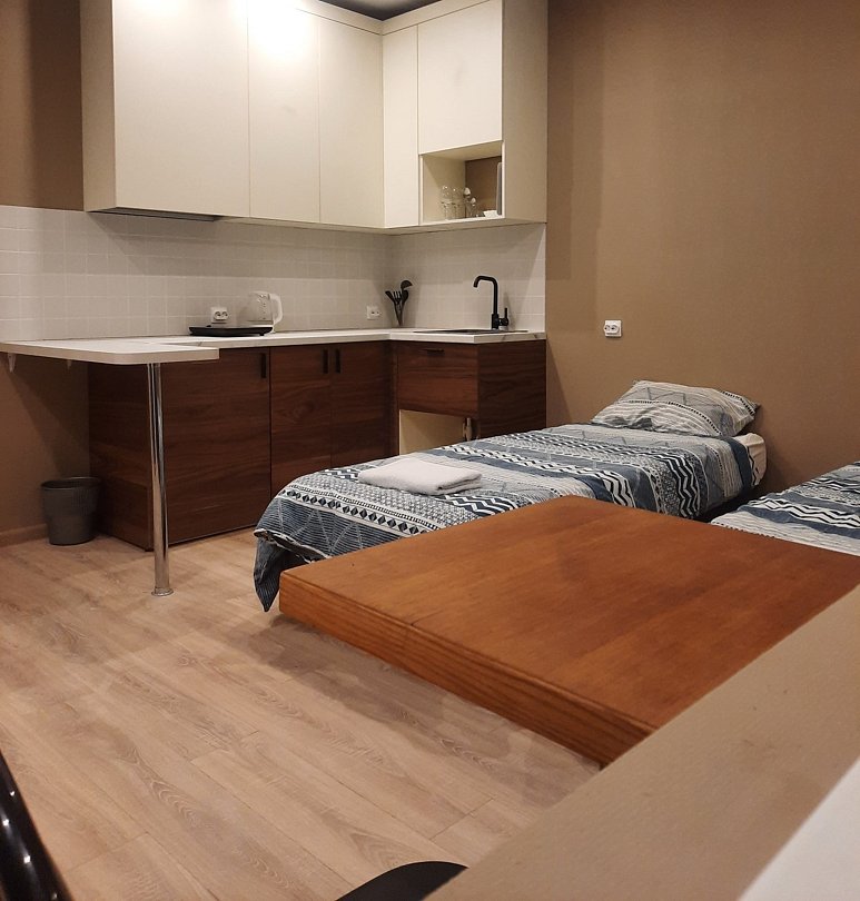 Апартаменты оснащены индивидуальной кухней, которой можно воспользоваться в любое время. На ней есть посуда, электроплита, электрочайник, холодильник, микроволновая печь и обеденный уголок.