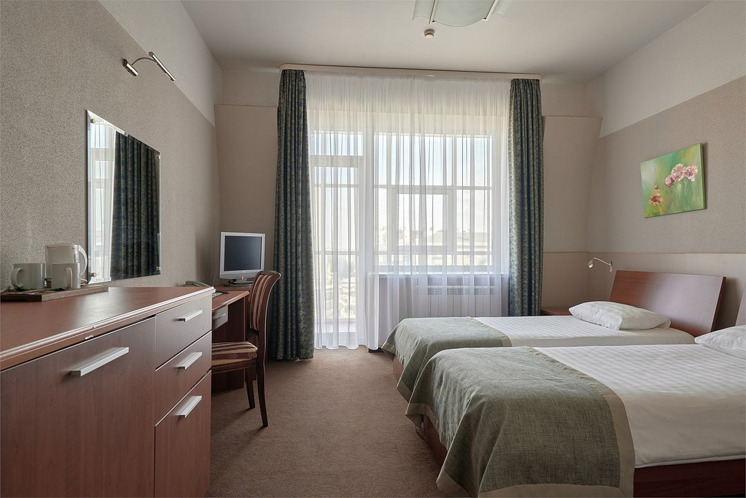 телевизор, спутниковое телевидение, кабельное телевидение, Wi-Fi, интернет, телефон, кондиционер, светильник, фен, система безопасности, электронные замки, ванная комната, ванна, банные принадлежности, халаты, тапочки, косметические средства, балкон, две двуспальные кровати, тумбы, шкаф для одежды, гардеробная, вешалки, письменный стол, багажная тумба, зеркало, звуконепроницаемые стены и окна, чайный набор, обслуживание номеров, информационная карта, меню, сейф, чайник, унитаз, раковина, косметическое зеркало, питьевая вода, ковровое покрытие, отопление, вид на город, высокие потолки, стаканы, стул, туалетные средства, сплит-система, цифровое тв, внутренний телефон, телевизор с плоским экраном, мини-холодильник, шкаф-купе, гостиничная парфюмерия, номер для некурящих, фанкойл, рабочий столВ гостиничном номере