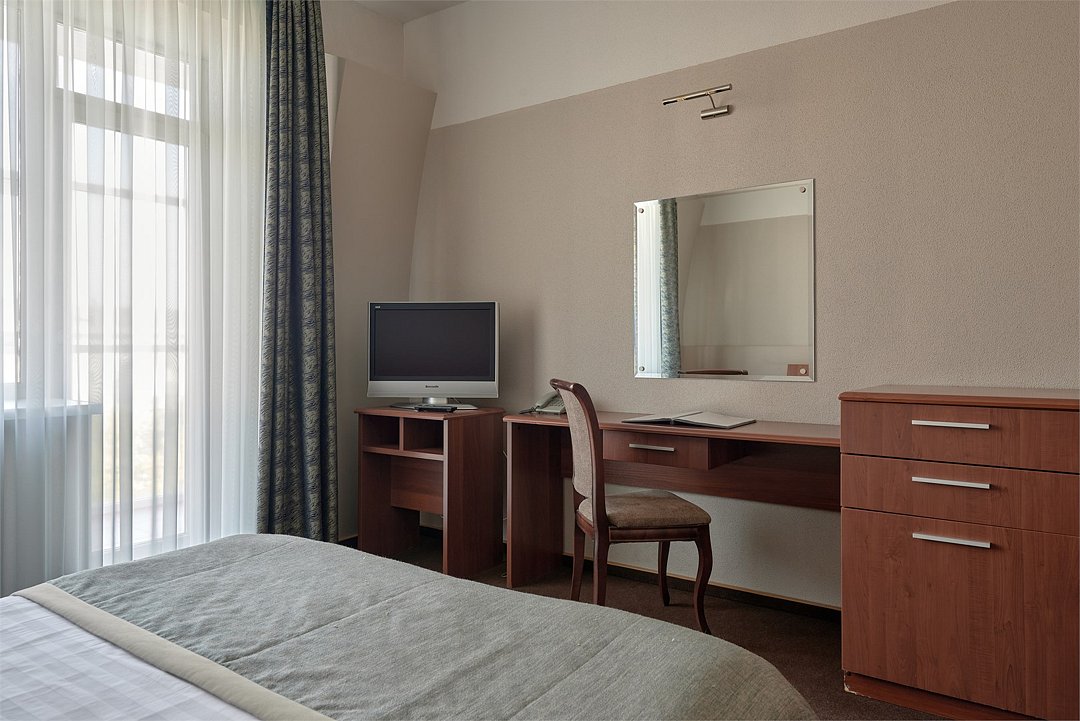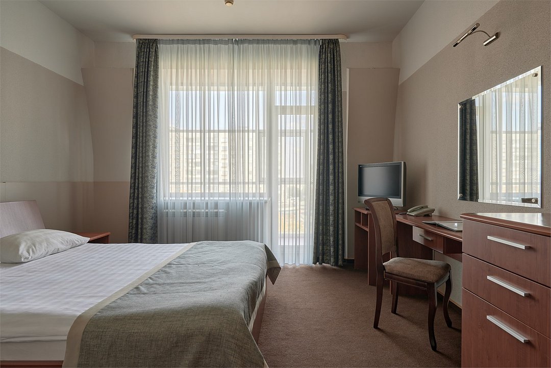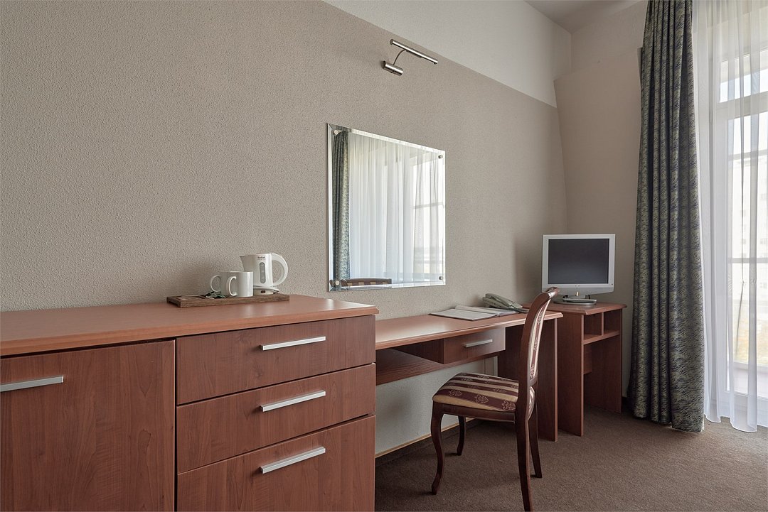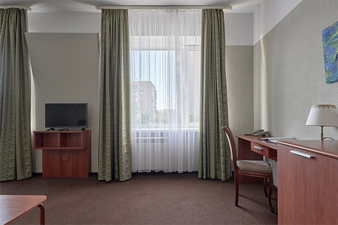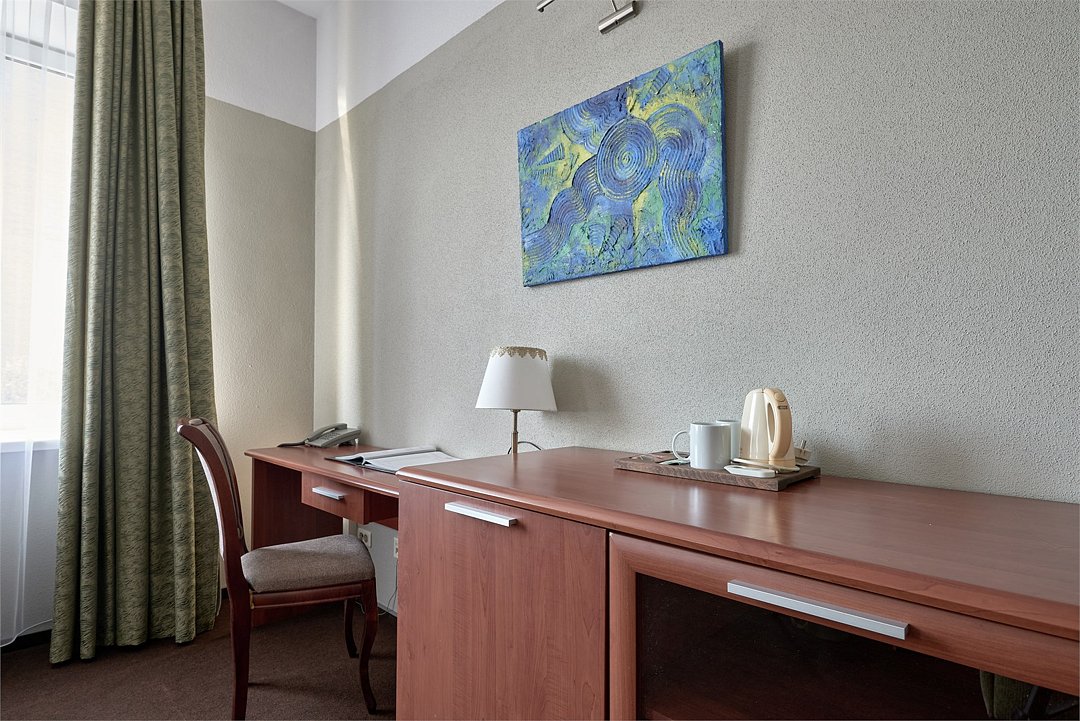 телевизор, спутниковое телевидение, кабельное телевидение, Wi-Fi, интернет, телефон, холодильник, кондиционер, светильник, фен, система безопасности, электронные замки, ванная комната, ванна, банные принадлежности, халаты, тапочки, косметические средства, балкон, кровать «Queen size», двуспальная кровать, тумбы, шкаф для одежды, гардеробная, вешалки, письменный стол, багажная тумба, зеркало, звуконепроницаемые стены и окна, чайный набор, обслуживание номеров, информационная карта, меню, сейф, чайник, унитаз, раковина, косметическое зеркало, питьевая вода, ковровое покрытие, отопление, вид на город, высокие потолки, стаканы, стул, стол, туалетные средства, сплит-система, цифровое тв, внутренний телефон, телевизор с плоским экраном, мини-холодильник, шкаф-купе, гостиничная парфюмерия, номер для некурящих, фанкойл, рабочий столВ гостиничном номере