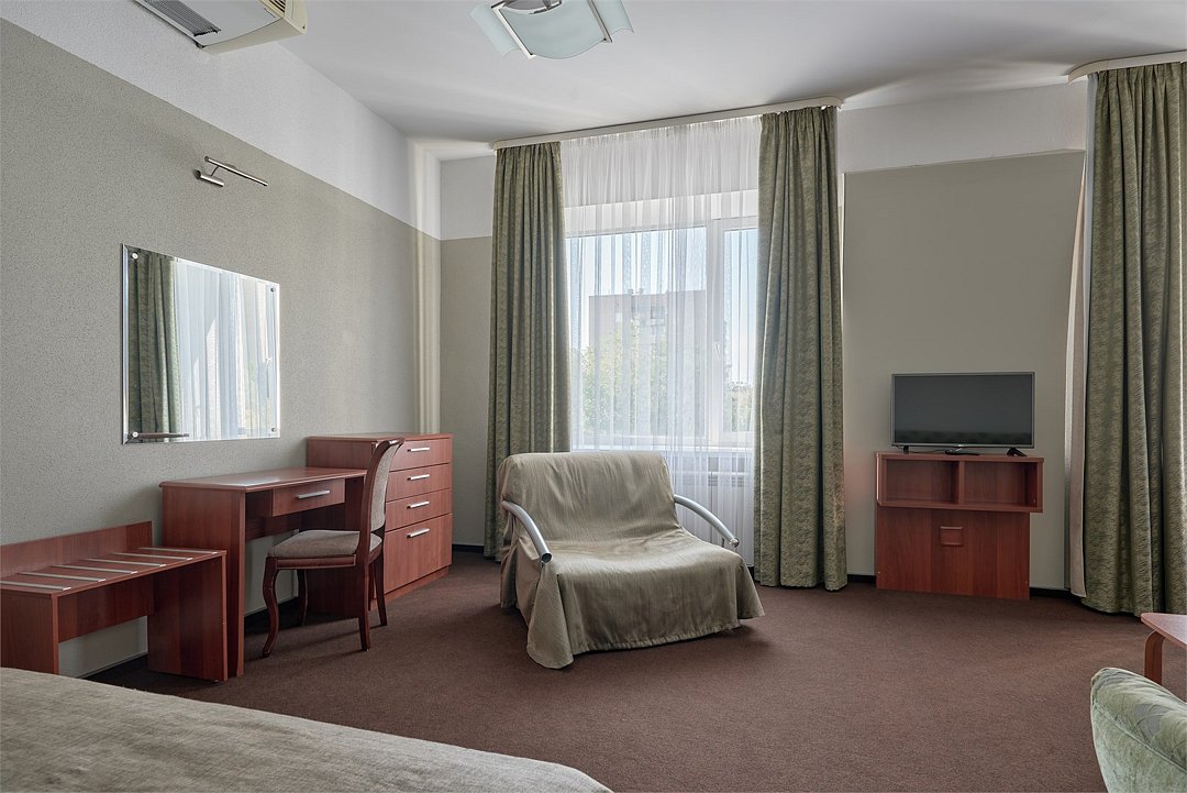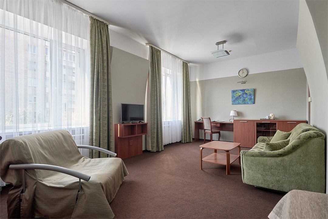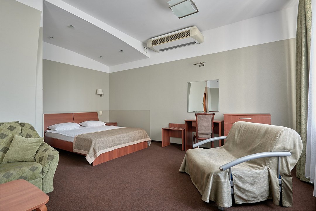 Просторный полулюкс с современной мебелью, телевизором с плоским экраном и собственной ванной комнатой с банными халатами и тапочками. 1 большая двуспальная кровать, 1 двойной раскладной диван, 1 раскладное кресло-кроватьУслуги и удобства