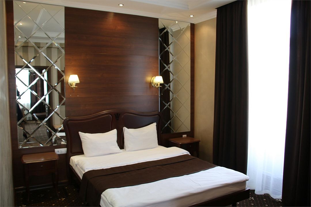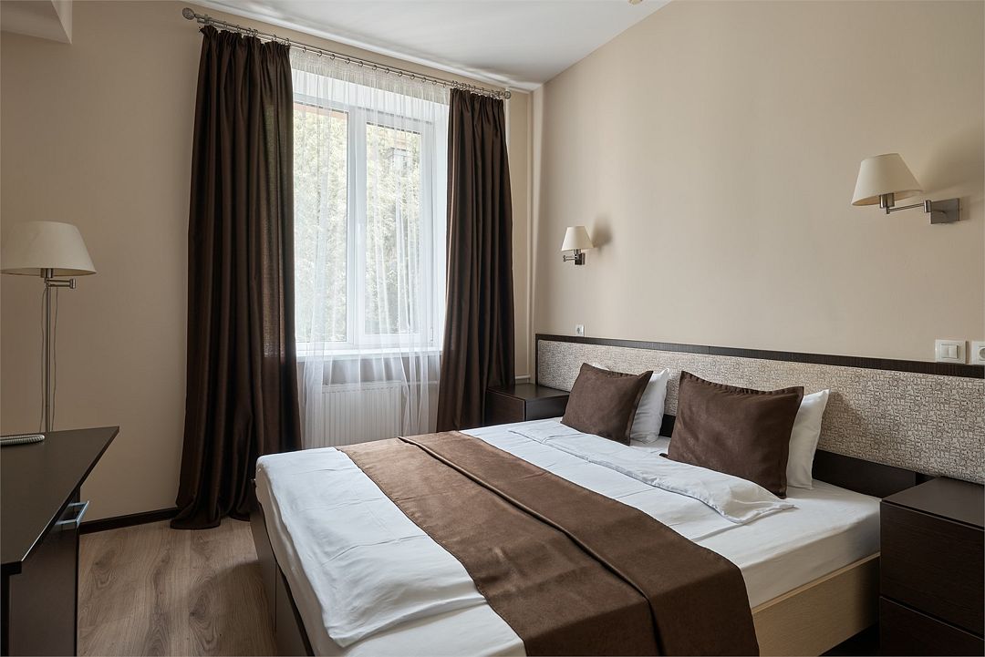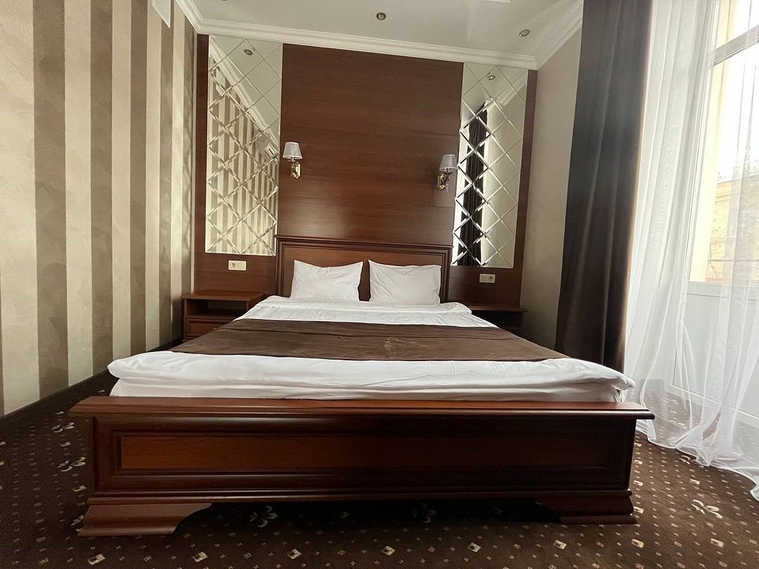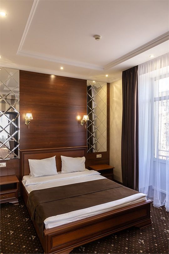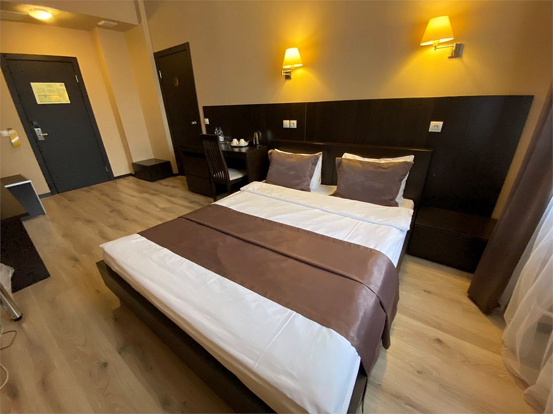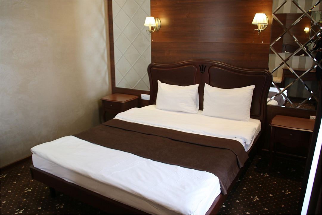 «УЛУЧШЕННЫЙ НОМЕР» (20 м2, макс. 2 чел.) - представляют собой классический вариант: одна комната. Выполненный в бежевых тонах интерьер, мебель цвета венге – все это придает номеру исключительно благородный стиль. "SUPERIOR DOUBLE ROOM» - Двухместный номер с одной двуспальной кроватью. В ванной комнате: ванна, биде, комплект полотенец, косметические принадлежности, фен, халат, тапочки. Широкоформатный ЖК телевизор , высокоскоростной WI-FI Интернет, шкаф для верхней одежды, кондиционер, холодильник, мини-бар (платно), сейф (бесплатно), письменный стол, ванна, двуспальная кровать, фен, телефон, покрытие – ламинат.Услуги и удобства