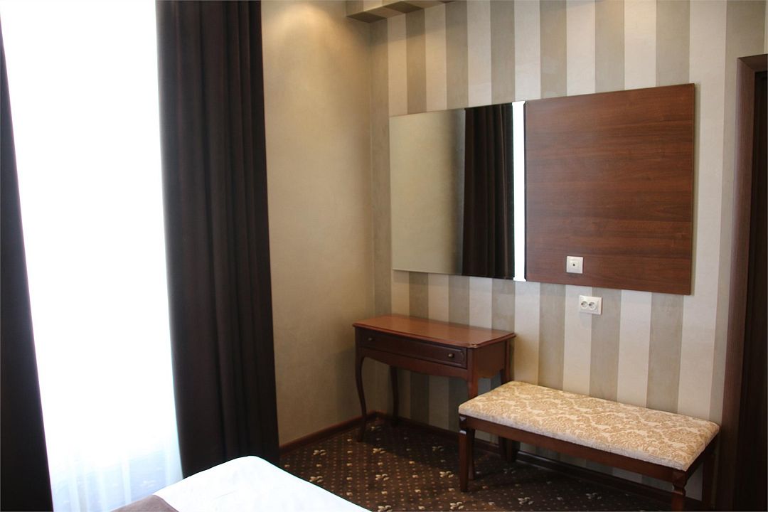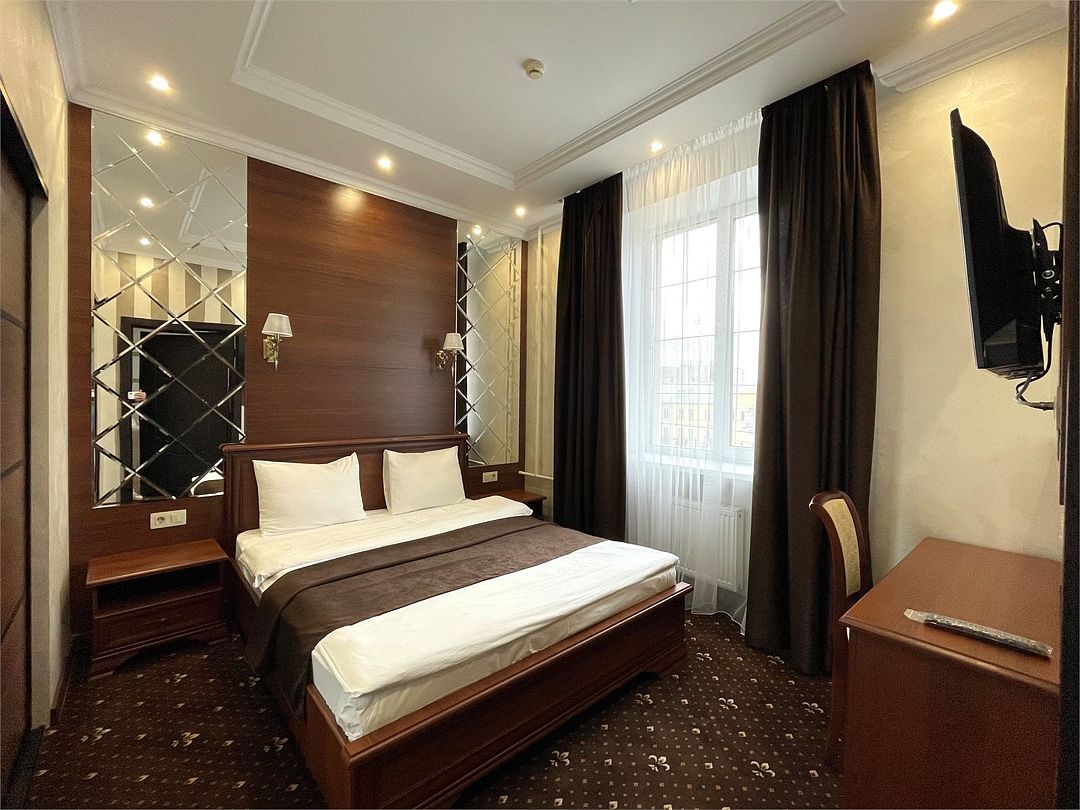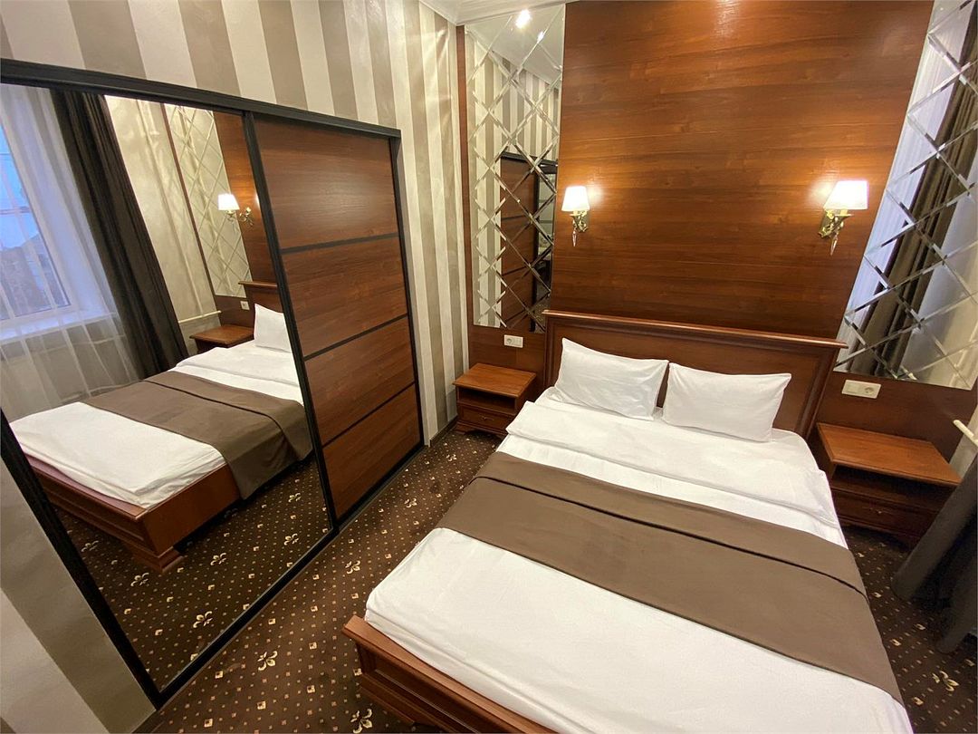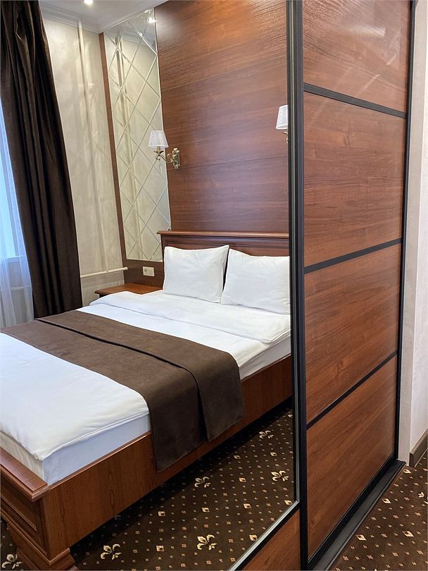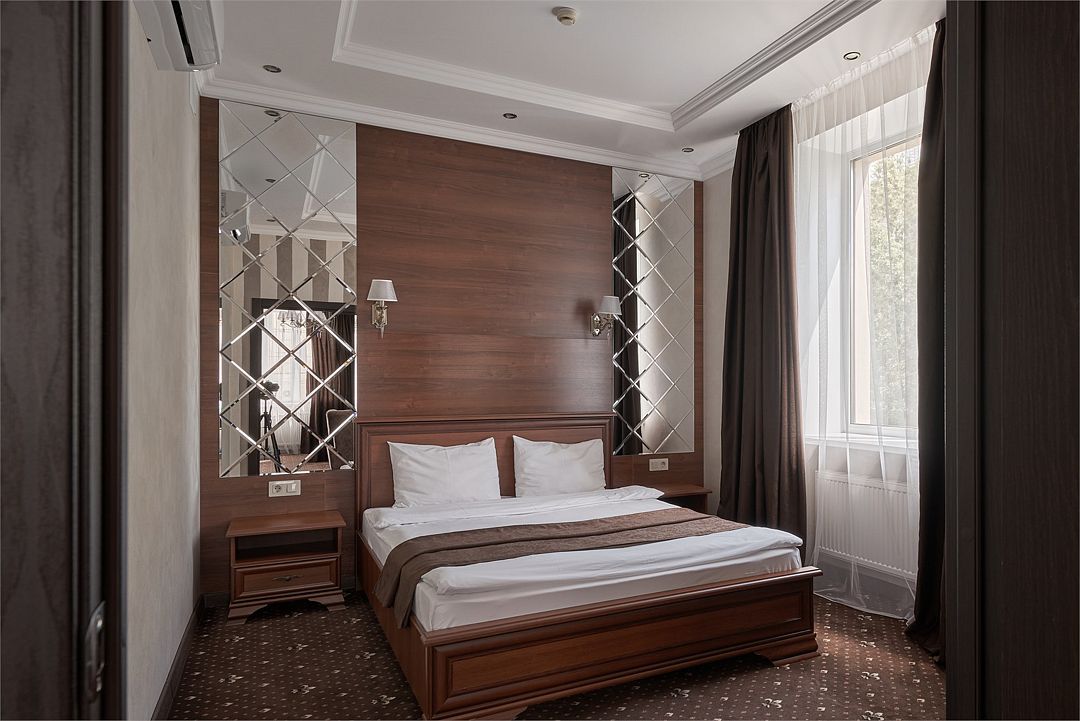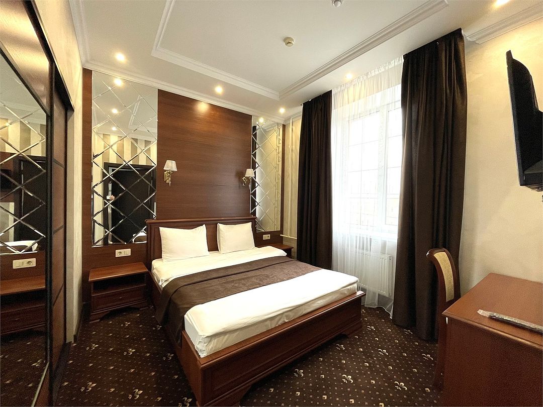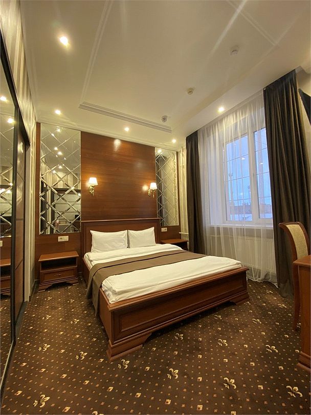 «УЛУЧШЕННЫЙ НОМЕР» (20 м2, макс. 2 чел.) - представляют собой классический вариант: одна комната. Выполненный в бежевых тонах интерьер, мебель цвета венге – все это придает номеру исключительно благородный стиль. "SUPERIOR DOUBLE ROOM» - Двухместный номер с одной двуспальной кроватью. В ванной комнате: ванна, биде, комплект полотенец, косметические принадлежности, фен, халат, тапочки. Широкоформатный ЖК телевизор , высокоскоростной WI-FI Интернет, шкаф для верхней одежды, кондиционер, холодильник, мини-бар (платно), сейф (бесплатно), письменный стол, ванна, двуспальная кровать, фен, телефон, покрытие – ламинат.Услуги и удобства