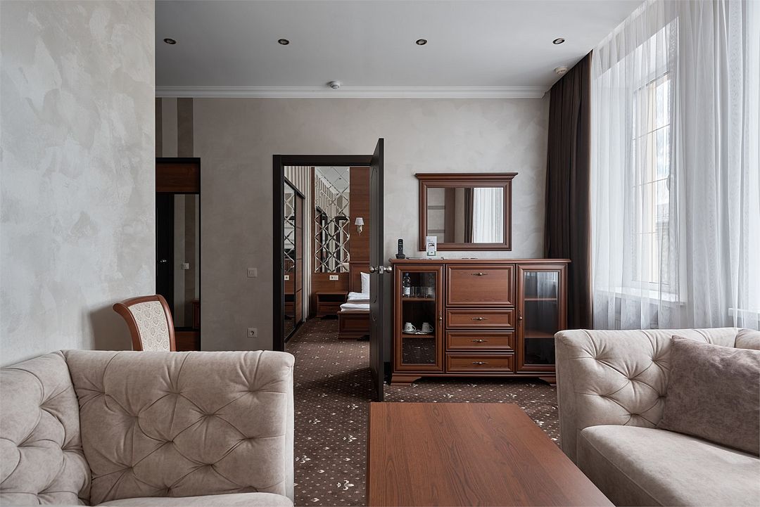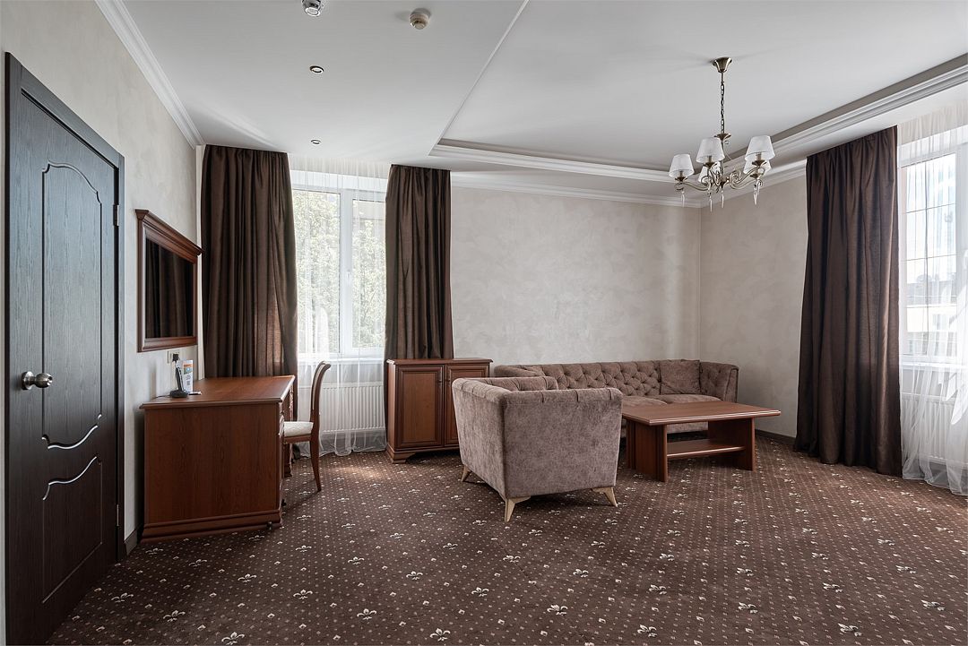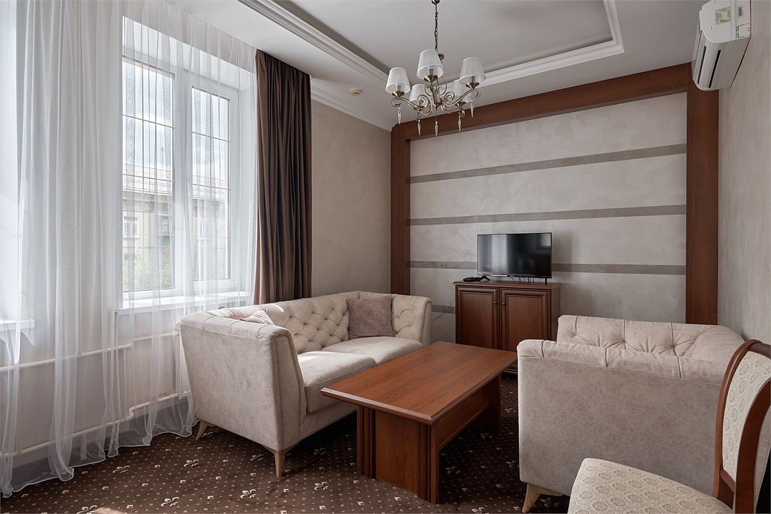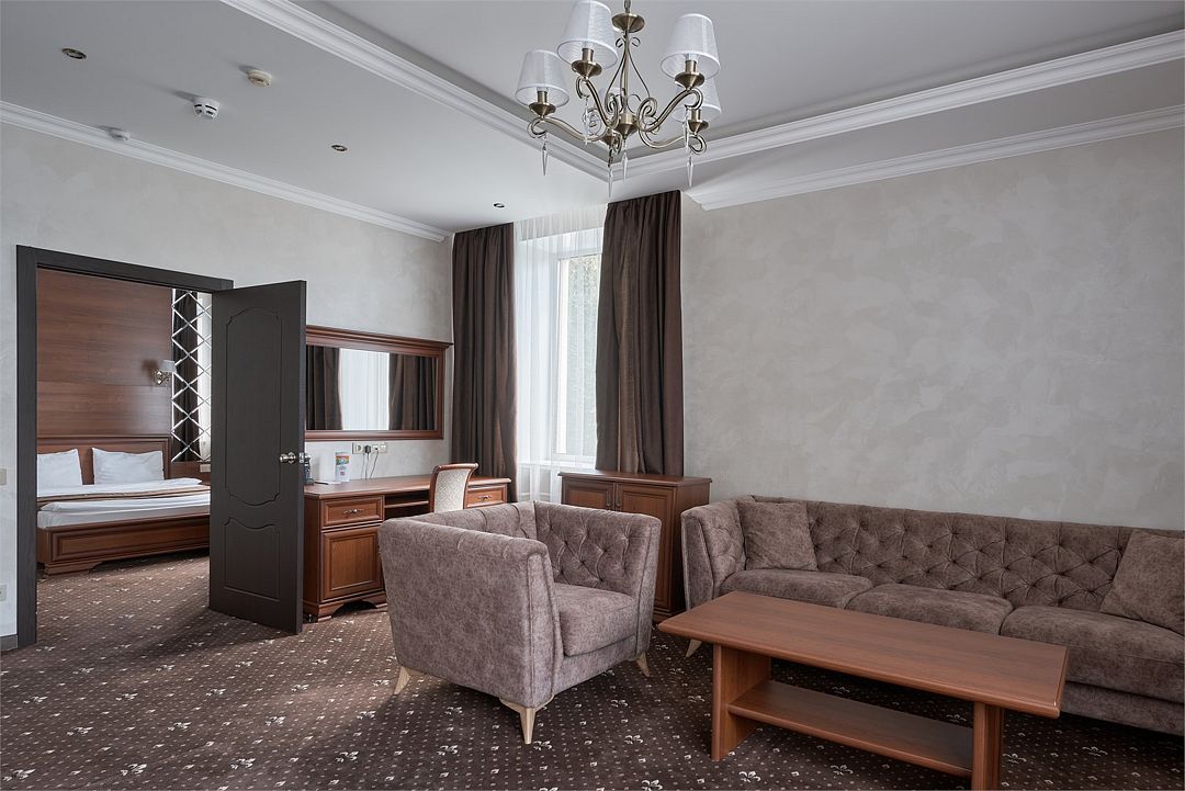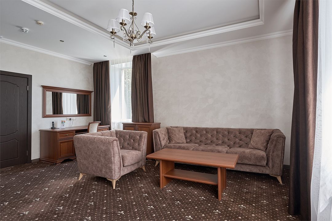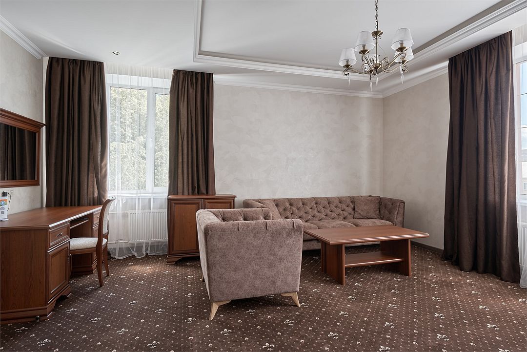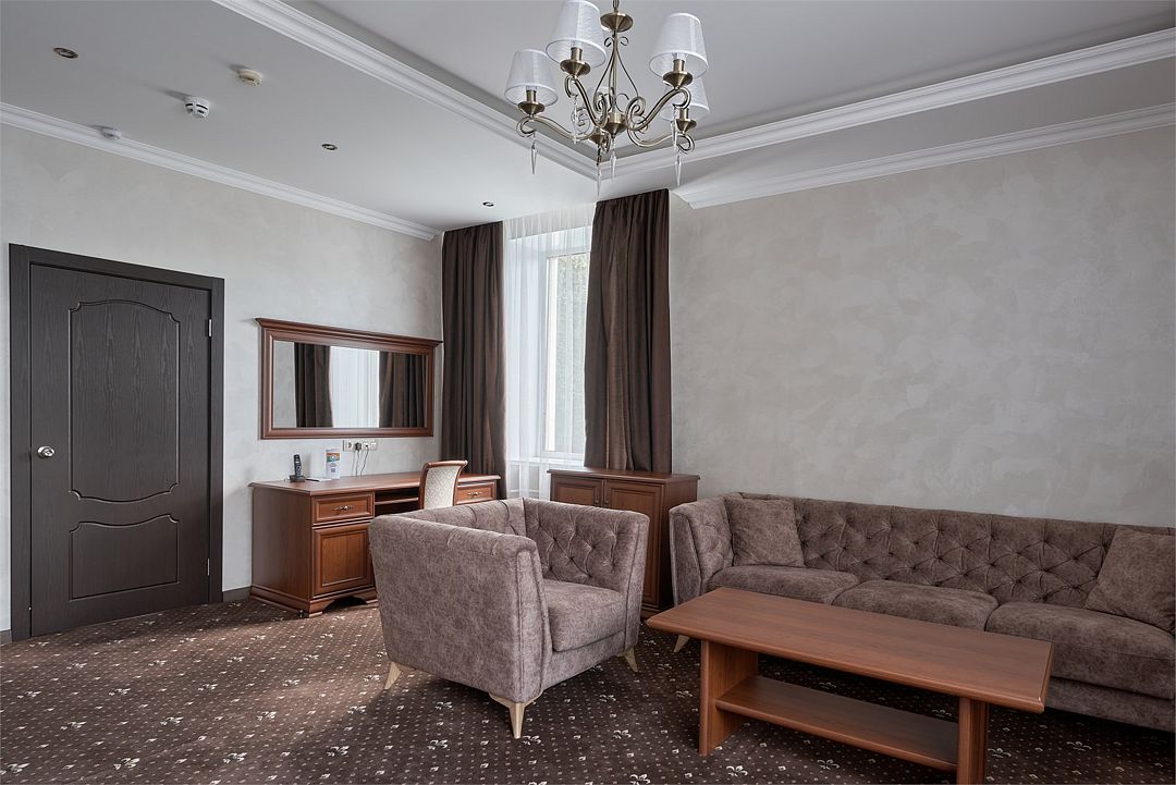 «Люкс Комфорт» (50 м2, макс. 2 чел.) - представляют собой классический вариант: две комнаты – гостиная и спальня. Номер оформлен в классическом стиле с элементами современного дизайна. Тёплые цвета интерьера создают уютную атмосферу, подходящую для отдыха и работы. Просторная спальня с большим окном обеспечивает естественное освещение в течение дня. Гостиная зона приглашает отдохнуть на удобном диване. Оснащение номера: Двуспальная кровать Удобный диван и кресло в гостиной Телевизор Шкаф-купе с зеркалом Письменный стол Кондиционер Холодильник Шторы и легкие занавески для регулировки освещения Мини-барУслуги и удобства