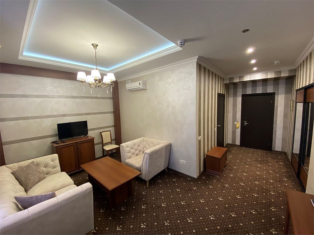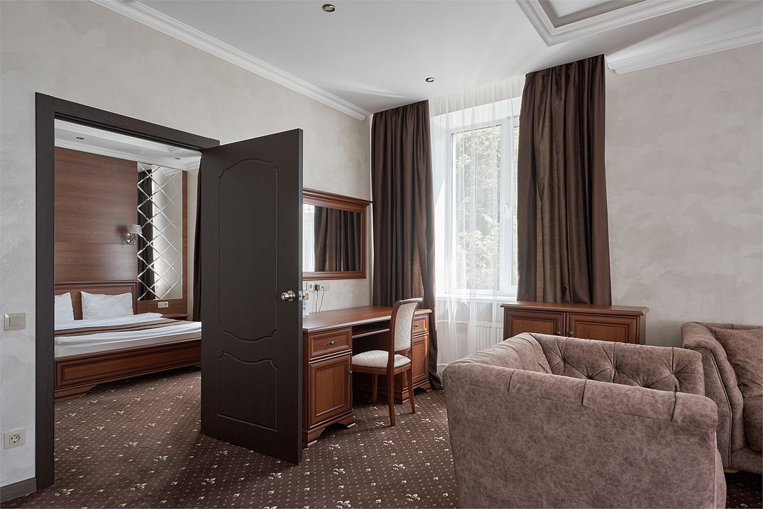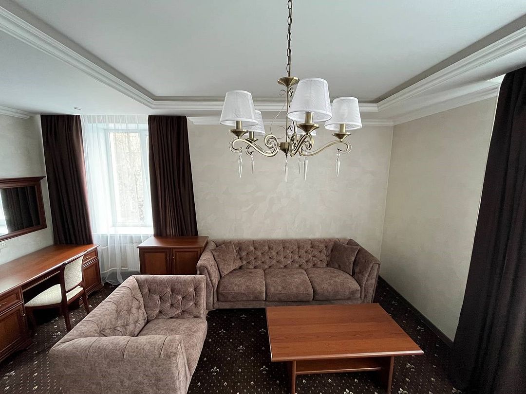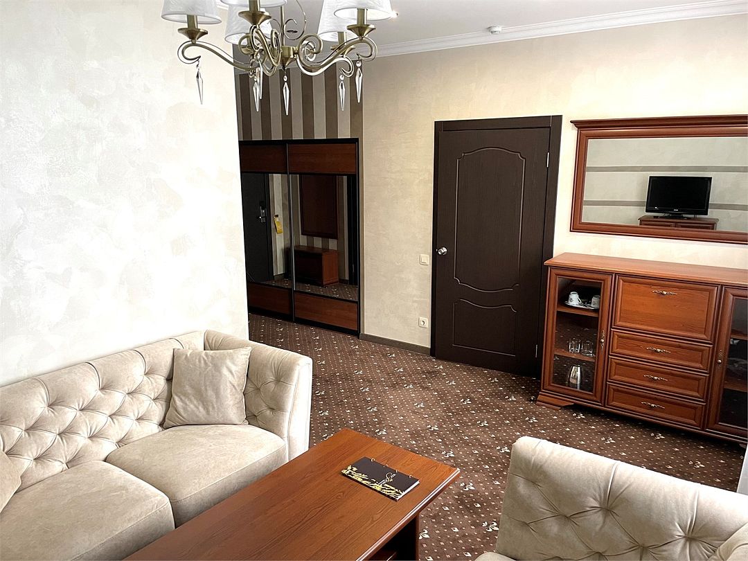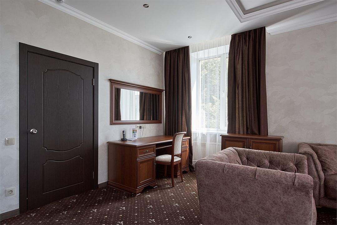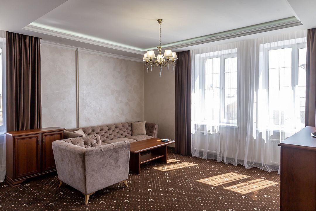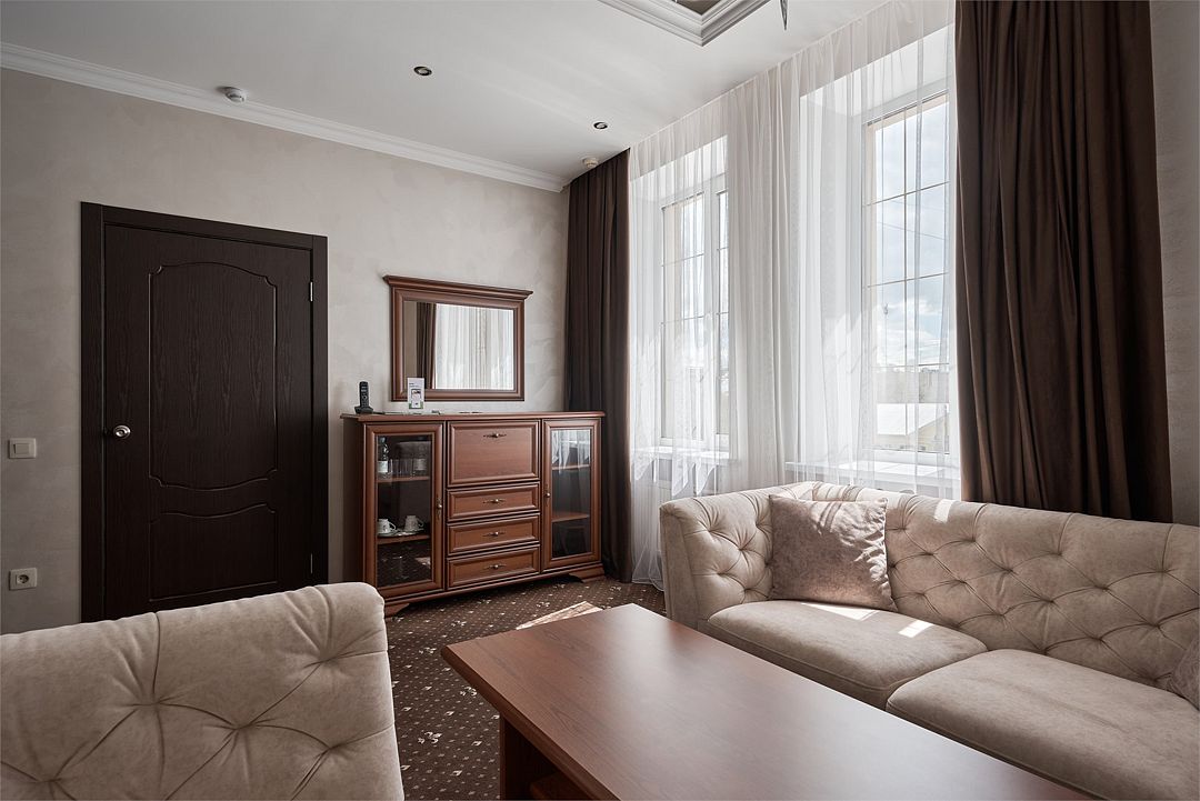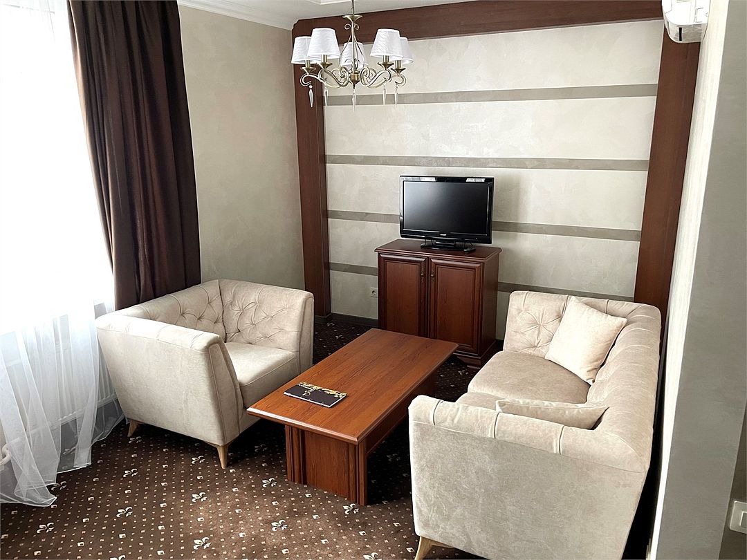 «Люкс Комфорт» (50 м2, макс. 2 чел.) - представляют собой классический вариант: две комнаты – гостиная и спальня. Номер оформлен в классическом стиле с элементами современного дизайна. Тёплые цвета интерьера создают уютную атмосферу, подходящую для отдыха и работы. Просторная спальня с большим окном обеспечивает естественное освещение в течение дня. Гостиная зона приглашает отдохнуть на удобном диване. Оснащение номера: Двуспальная кровать Удобный диван и кресло в гостиной Телевизор Шкаф-купе с зеркалом Письменный стол Кондиционер Холодильник Шторы и легкие занавески для регулировки освещения Мини-барУслуги и удобства